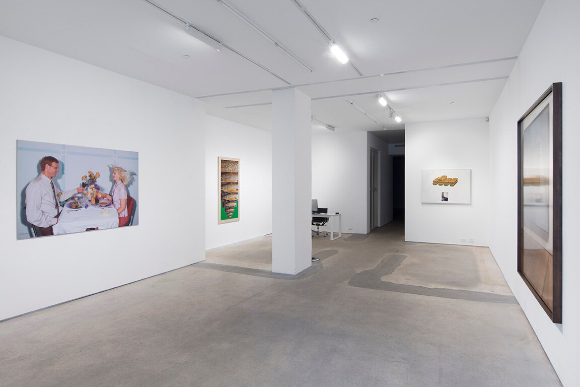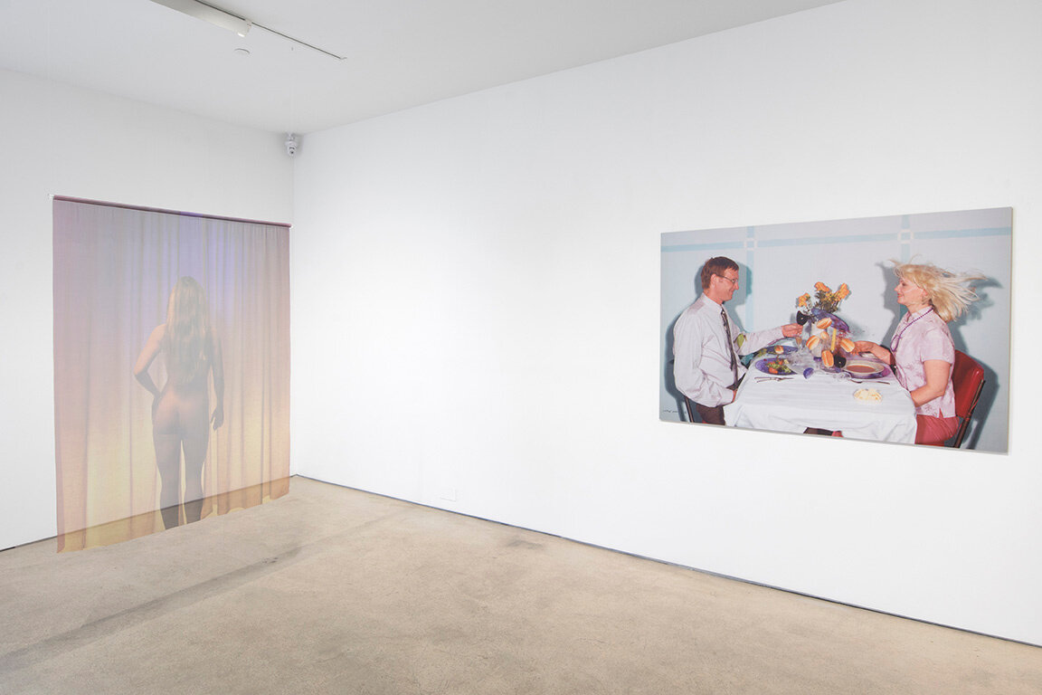 The combination of humor with indications of the indelible presence of the camera is also a thread in Snow’s photo-based works, where he is interested in the stasis of the stopped-time photographic image. Flash! 20:49, 15/6/2001, 2001 captures a couple at a moment of disorder. The titular flash is both descriptive and performative, as the burst of light is what enables the photo to be taken, but it also takes on a physical presence in the resulting image as an unseen force blowing back hair, launching bread rolls into the air, and spilling wine—disturbing the very scene it is meant to arrest.