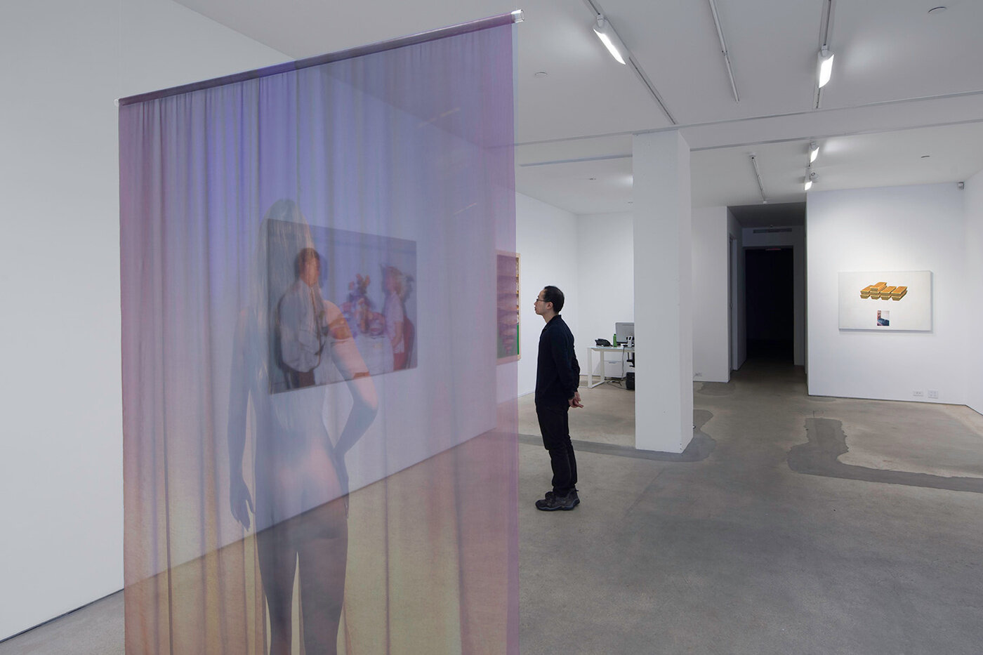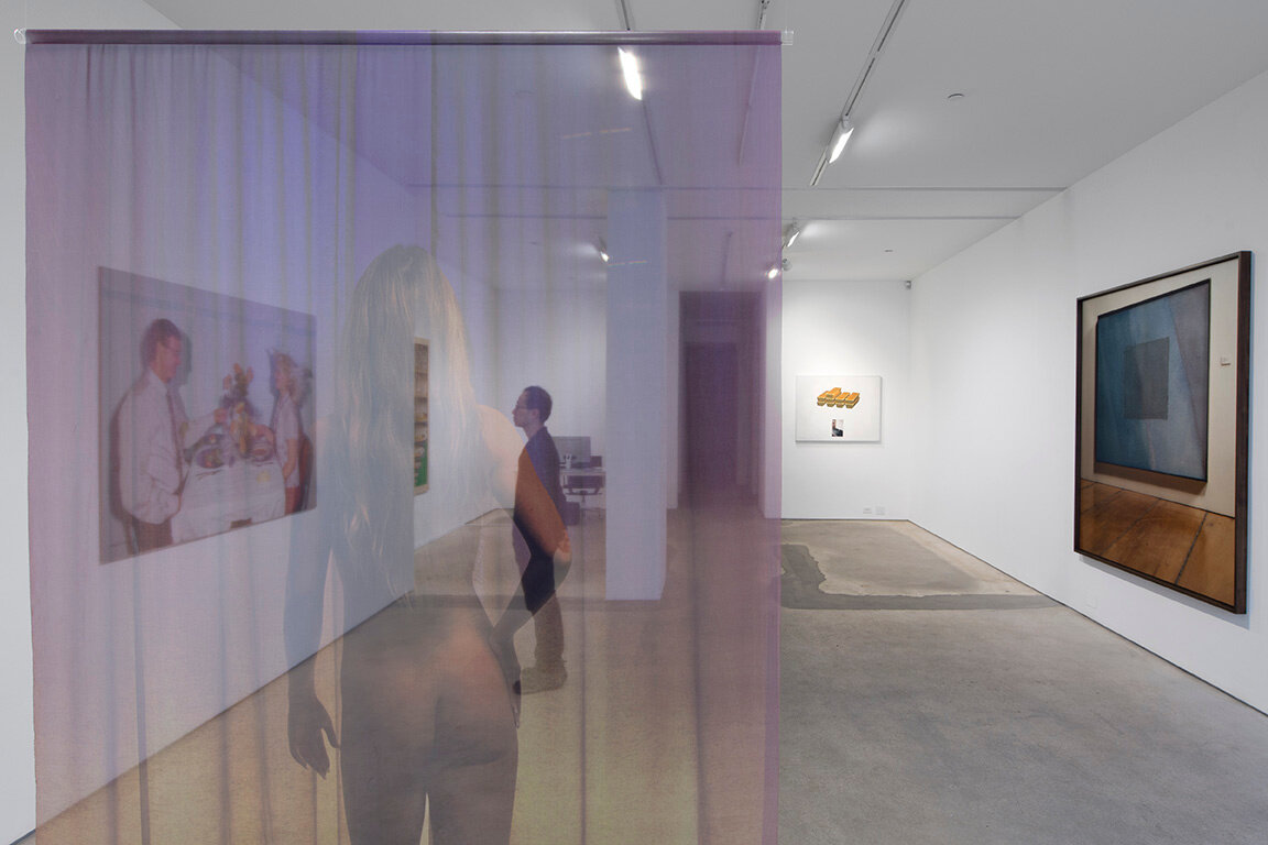 Similarly taking the physicality of photography as its aim, VUEƎUV,1998 hovers between photograph and sculpture. An image of a woman's backside is printed on a see-through scrim and hangs life-size in the gallery space. In this work, Snow zeros in on the very process of photography. Normally cast off as just the means to the photographic print, here the transparency stands alone, while on both sides its subject’s gaze denies that of the viewer’s.