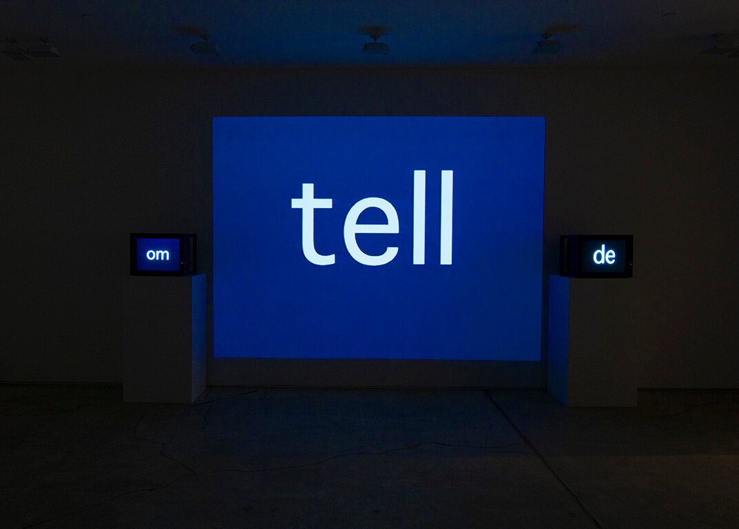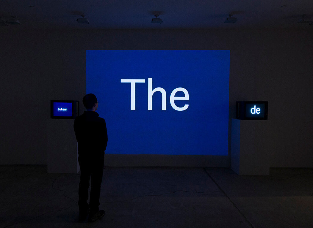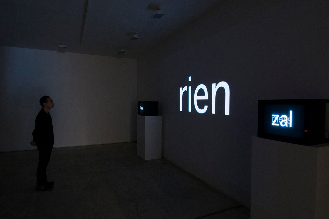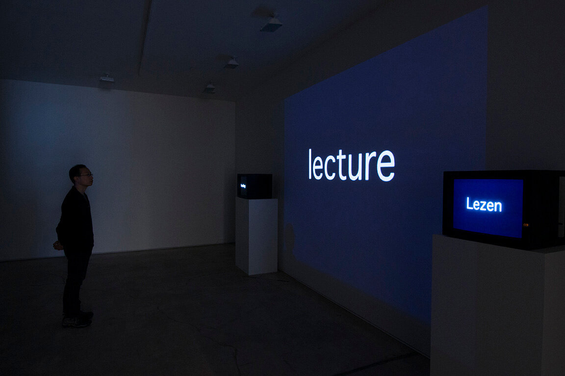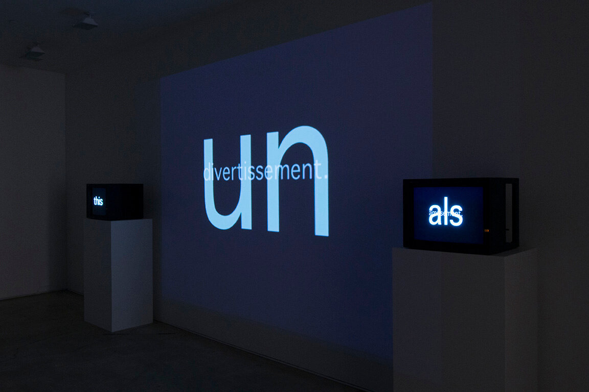 On the occasion of the exhibition, That/Cela/Dat, 2000 will be on view for the first time in New York. Humor and language are key tenants in Snow’s oeuvre, and this playful video installation considers how words like “this” or “that” point to something outside of language to convey meaning. A projection and two monitors on either side display the same text, one word after another, in English with simultaneous French and Dutch equivalents. The three languages shift position at 17 minute intervals. Cumulatively, the text directly addresses the viewer and raises self-consciousness through witty turns of phrase. The work literally comments on the experience of viewing the work itself, and leaves the viewer to consider if a work of art continues to exist long after its beholder has left. The disembodied narration in the video implores, “ If you turn your back on this, it will still be here. When you are looking at other things, it will still be here, hoping that you will come back to it. When you are away from this, in your memory, it will become that.”