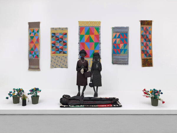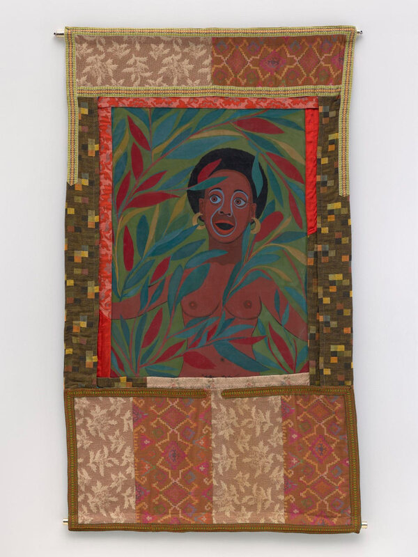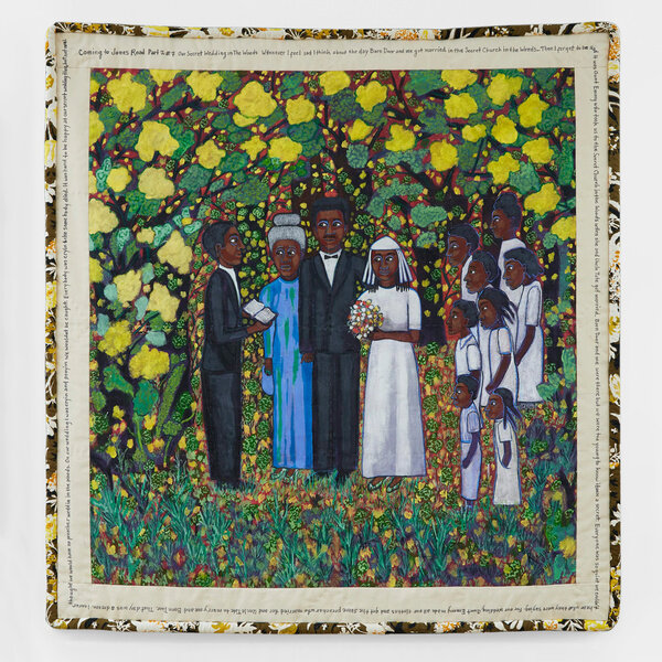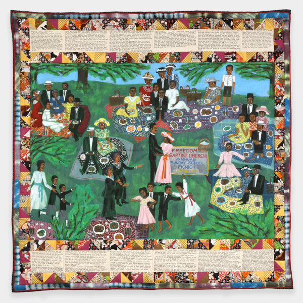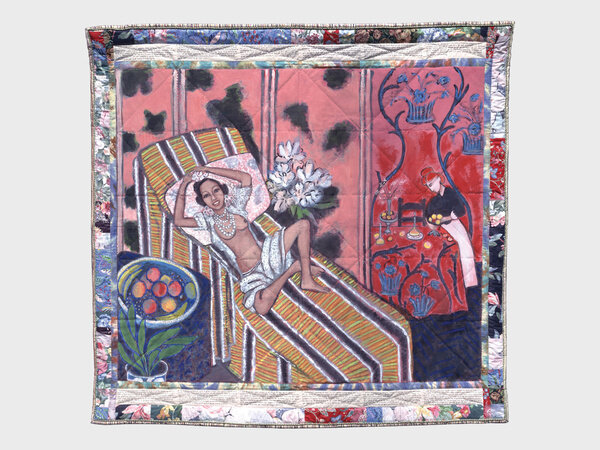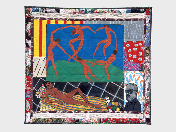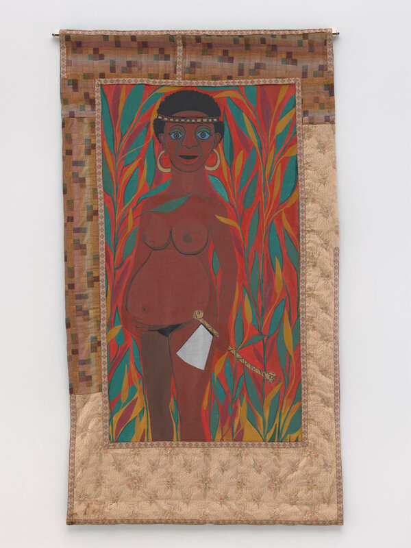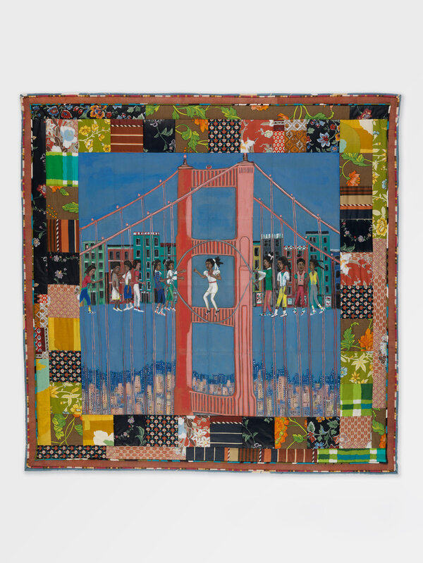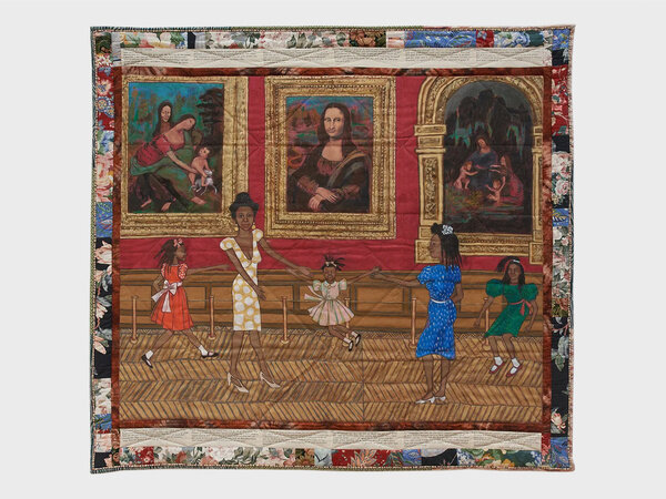 Ringgold’s desire to overcome the predominantly white art historical tradition led her to search for forms more suitable for the exploration of gender and racial identity, forms she found during her travels abroad in the 1970s, first to Europe and then to Africa. The soft sculptures, masks and unstretched canvases adorned with sewn fabric borders—inspired by Tibetan thangkas, which Ringgold called ‘tankas’—were the result of these exploratory trips and each would influence the creation of her quilt paintings and story quilts of the 1980s and 1990s. Her first quilt painting, Echoes of Harlem (1980), was made in collaboration with her mother, Madame Willi Posey, a prominent fashion designer in Harlem. From there, Ringgold went on to make her first story quilt, Who’s Afraid of Aunt Jemima? (1983), which, through its combination of European painting convention and the written word with the rich tradition of African-American quilt-making, would serve as a template for those to come. Regularly referencing her autobiography within episodes from the collective history of Black life in America, the story quilts are disarmingly intimate yet historically grand. They demonstrate the fundamental relation between the personal and the political that Ringgold’s art always understood.