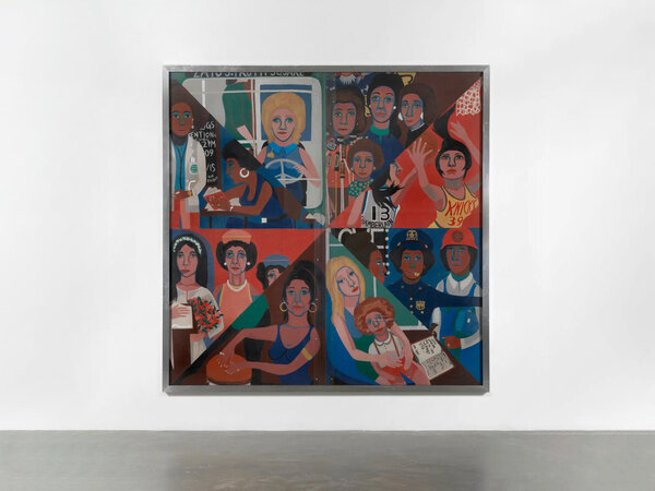 Ringgold’s extraordinary body of work originated from her political consciousness and activism during the 1960s and 1970s in Harlem, New York. By fusing together her own unique style of figurative painting—drawing from post-Cubist Picasso, Pop Art and traditional African sculpture and design—with a bold and innovative approach to composition, Ringgold created graphically complex works that highlighted the racial and gender inequalities within American society, first expressed through her series American People. She found applications for her unique formal sensibility within the context of political messaging as well, where she produced posters in support of the Black Panther Party and the freeing of activists such as Angela Davis. As an organizer in the 1970s, Ringgold was instrumental to the protests highlighting the lack of opportunities for women of color in the art world. Subsequently, in 1971, she established Where We At, Black Women Artists, Inc (WWA), a collective of black female artists who felt neglected not only by the mainstream, but also by the male dominated Black Arts Movement and the largely white Feminist one. Ringgold carried this advocacy further with the founding of the Anyone Can Fly Foundation in 1999, an organization which champions artists of the African Diaspora to audiences of all ages.