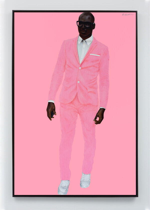 Hendricks culls subjects for his hagiographic portraits from sartorially minded friends and acquaintances he has encountered around the world, including travels to Jamaica, his hometown of Philadelphia, and Connecticut where Hendricks now lives and works. A youth in a sports jersey, baggy denim shorts, and a glistening stud in his ear exudes a confident cool, his masculine swagger juxtaposed against a diamond of bubblegum pink. The painting’s title—JohnWayne (2015)—underscores a cocksure presence.