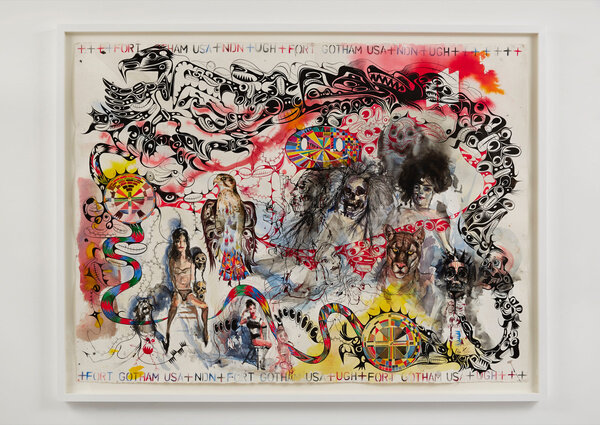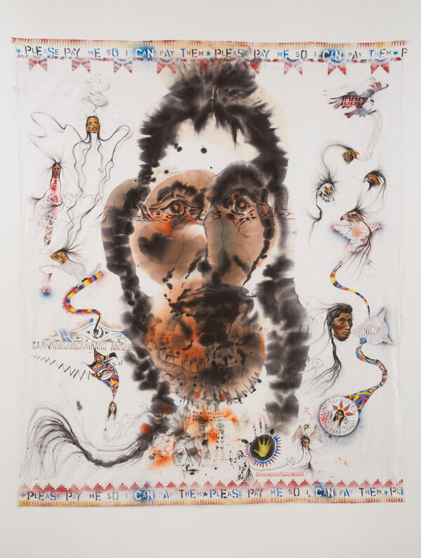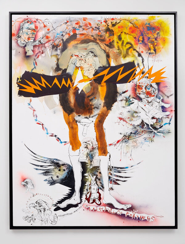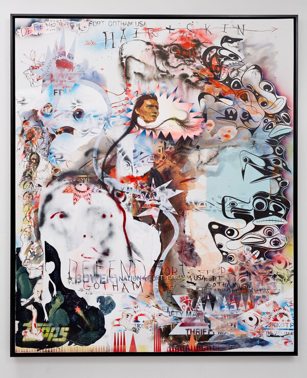 Over the course of his practice, Kahlhamer has worked within and between the mediums of painting, drawing, sculpture, installation, performance and music. This profusion of media builds layers of influence that are drawn from physical localities, daily surroundings, aesthetic experiences, collected ephemera and conjured histories that are both real and imagined. Through his paintings and sculpture new universes are built, simultaneously urban-rural and high-low with their own language of symbols drawn from such seemingly disparate sites as Topps Chewing Gum (his former employer), the Lakota Thrifty Mart in Eagle Butte, South Dakota, California skateboard culture, proliferative street art of Bushwick, Brooklyn and Kahlhamer’s personal taxidermy collection, to name only a few. The work has often been described as existing in and representing a “third place” measured by complexity and contradiction, its most salient attributes. Kahlhamer’s unruly methodology can serve as a mirror for a cross section of American cultures and their very consumption while also being a meditation on his own identity and his interest in the “re-wilding” of himself and the contemporary tribal male.
