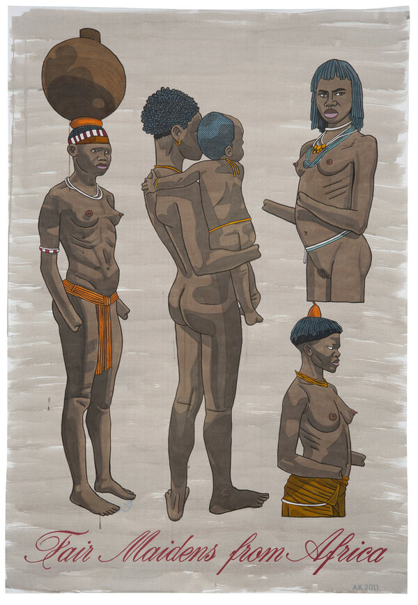 By calling his new exhibition After the Barbarians, Kannemeyer makes reference to P. Cavafy’s classic poem “Waiting for the Barbarians,” which the South African Nobel-prize winner J.M. Coetzee used as a title for his allegorical novel dealing with the horror and absurdities of colonial thinking. In Coetzee’s text, the natives are the “barbarians,” whereas in Kannemeyer’s work, such as B Is for the Beauty of Military Life, the civilized Western colonizers of Africa seem to be the real barbarians.