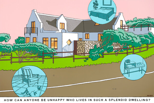 It is no wonder that Kannemeyer’s art makes viewers uncomfortable about definitions of black and white, European and African. He paints post-colonial Africans as the hell-bent illegitimate children of violent historical rape, both victims and perpetrators. He implicitly asks how the clear-cut categories and neat names expressed by political correctness could accurately describe the violent mess that has spawned the likes of Apartheid, Idi Amin, and the genocide in Rwanda. On the other side, he confronts the affluent South African suburbia where Western luxuries are lined with apocalyptic fear and xenophobia.