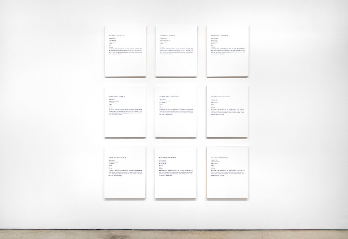 All the Boys (2016) responds to the recent killings of young African American men and suggests a darker reality of identity construction. Portraits of black men in hooded sweatshirts are matched with text panels. The written descriptions evoke police reports, underscoring how a demographic is all-too-often targeted and presumed guilty by a system plagued with prejudice.
