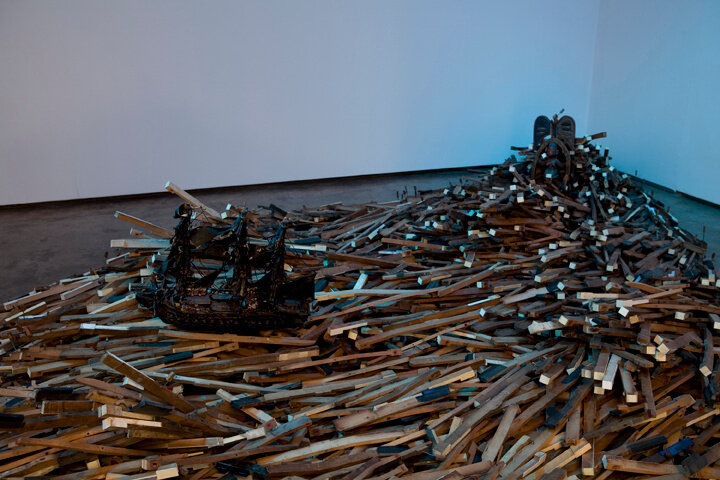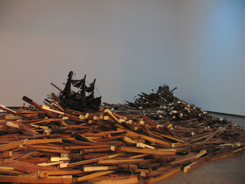 The largest work on display incorporates hundreds of piano keys, a found African sculpture, several ship sculptures covered in black glitter, and a metronome. Eerily suggestive, the work spills across the floor, nearly inhibiting passage into the gallery. In this and in all of the works, Bailey’s skillful combinations of objects are exemplified; some remain in their found states while others are carefully manipulated with paint, collage, and assemblage. Foregoing cynicism and mere nostalgia, Bailey asks that we reconsider the accuracy of recorded history by way of the cumulative connotations of objects and images.