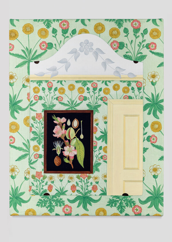 In looking glass house #1, Suss explores perspective and scale in intimate paintings that use reflection and inversion to depict multiple, opposite views at once, ultimately fragmenting the picture plane and disturbing our sense of space. The title is a reference to Through the Looking-Glass by Lewis Carroll, in which the protagonist Alice climbs through a mirror’s reflection to enter the fantastical, illogical world beyond. With these portals and careful departures from exact reality, Suss provides access to intangible, psychological dimensions that are ever shifting, as well as the universal strangeness of childhood.