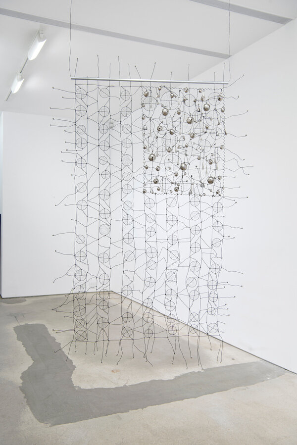 Brad Kahlhamer’s oeuvre of paintings, works on paper, and sculpture is a site of synthesis concerned with what the artist terms “the spiritual rebar” that under grids American culture, blending references as diverse as music, comic books, art history, and Plains ledger drawings from the nineteenth century. His Super Catchers (2014—ongoing) draw on the Native American tradition of dreamcatchers. Industrial metal wire and jingle bells come together in intricate constellations mixing the sacred with the commonplace. In Untitled (2017), the distinctive super catcher motif delineates the American flag, fusing two cultural icons into one hybrid symbol.