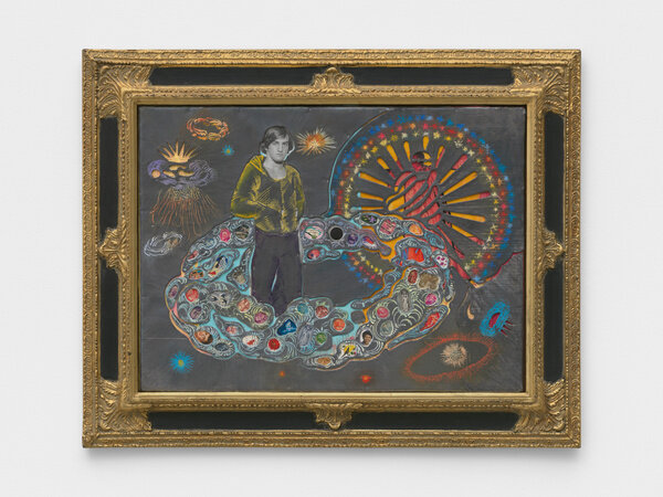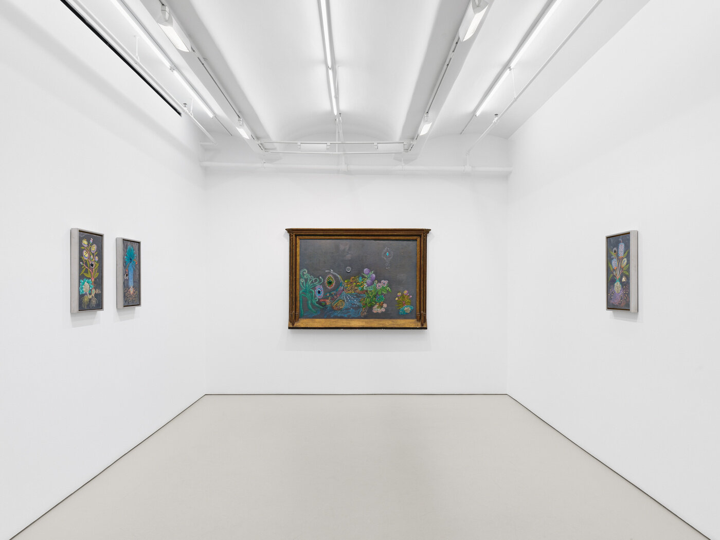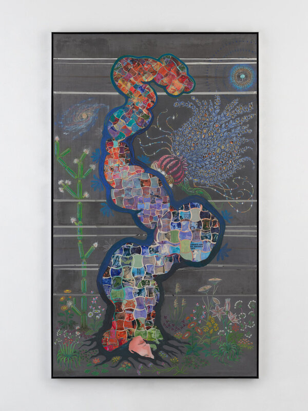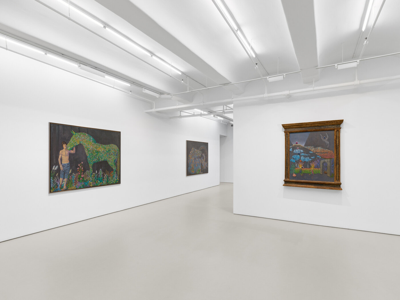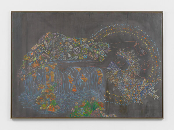 Rooted in ancient Greek and Roman philosophy, the concept of ‘anima mundi’—or, ‘soul of the world’—suggests that all matter is bound together and connected as if by a single, unitary soul. In Vega’s work this connection is expressed in many ways, from subject to composition to use of materials. Several of the works in the exhibition show Vega creating form and relationships between them in a new way, where the distinction between figure and the surrounding world is blurred or done away with entirely. In works such as Levi (2025), the figure of a horse is described with an intricately constructed network of flora and fauna, suggesting that it is one and the same as the nearly kaleidoscopic arrangement of precisely rendered flowers. In Géa (Gaia) (2025) the primordial goddess of the Earth is shown as an ethereal being shimmering through her body of plants and flowers, much like the horse in Levi. In both works, the brilliant color and elegant forms invokes Vega’s belief in the majesty—and complexity—of life itself.