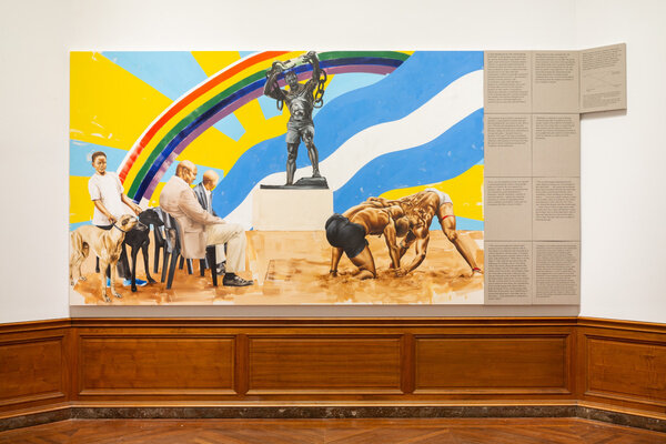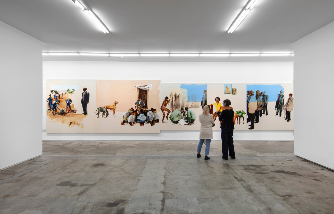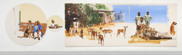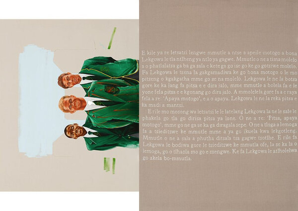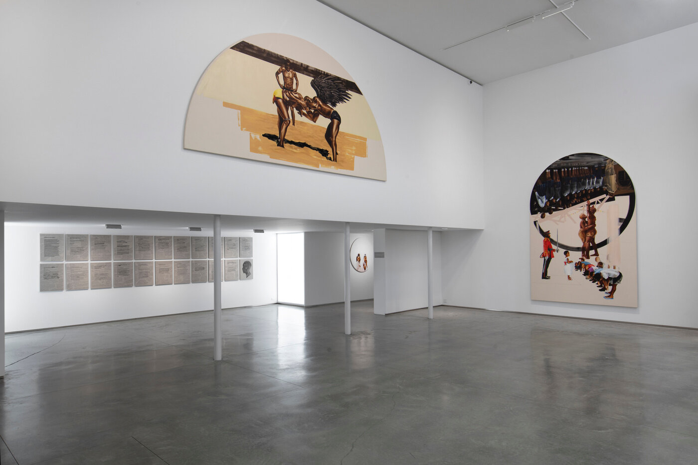 This exhibition brings together works from seven of the eight chapters of the project (Exordium; Comrades; Lerato; Lex; Acts of Resistance; Objects of Desire; and Chimurenga) in a unique opportunity to view the progression of Mokgosi’s contemplation and investigation of democratic ideals. The content of the work is based on images of southern African life, art history, and the artist’s extensive research. Influenced by cinematic theory, Mokgosi storyboards each chapter and installs his canvases to mimic the filmstrip, creating narrative juxtapositions that communicate and complicate meaning. Drawing from history painting and propaganda, Mokgosi includes iconographic details in his compositions that may not be recognized or understood by a Western audience. By combining broadly legible themes with pointed, specific imagery, Mokgosi encourages a desire in the viewer to understand a history beyond what is already known.