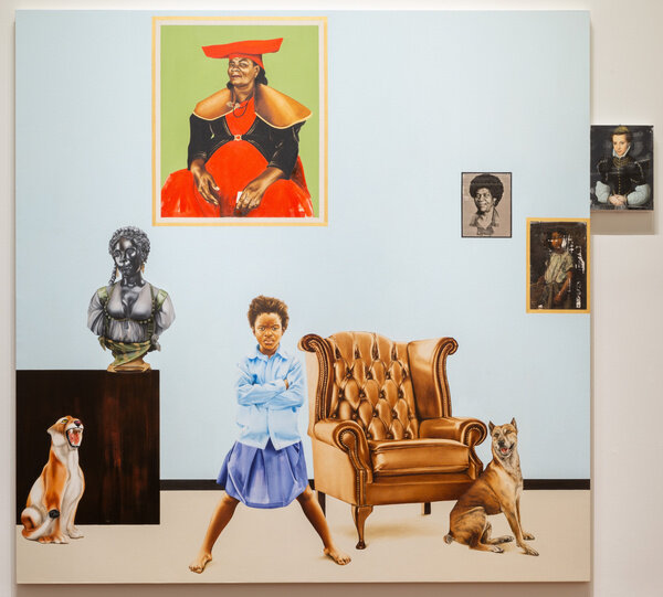 Painting large-scale canvases in a style deliberately reminiscent of European history painting allows Mokgosi to subvert colonial-era narratives in subtle and powerful ways by using the language of a grand European tradition to tell the broad story of postcolonial southern Africa. As the championed genre and the standard by which early modern society understood its ideals in images, history painting in Europe was a summation of western moral and aesthetic principles. These ideals included knowledge, reason, and honor, but also bellicosity, elite sovereignty, white supremacy, and the patriarchy. Strategically used by and for European imperialism, it is a genre that Mokgosi has reinvented to tell an alternate history. In the chapters Objects of Desire and Chimurenga (2019) Mokgosi has chosen to reinterpret a historically lower genre of painting – the still life – to explore the contemporary African object, given its legacy as a tool for the Modernists.