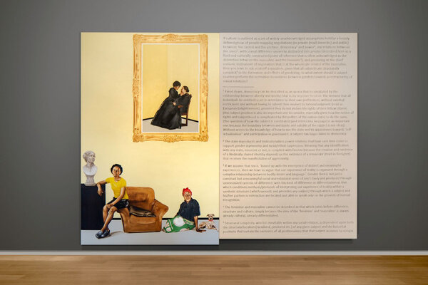 Love (2016), or Lerato in the artist’s native language, Setswana, uses William-Adolphe Bouguereau’s historical paintings as a compositional case study to explore allegory and forms of love through experimentation with visual and narrative strategies that do not depend on sequential expectations. Here, Mokgosi is particularly interested in how the allegoric form necessitates the viewer’s awareness of their own thought processes in their appreciation of the content.