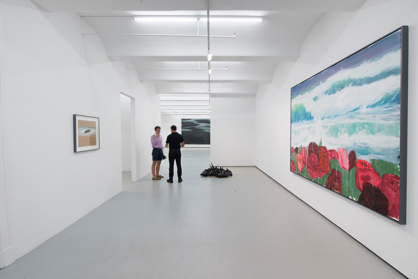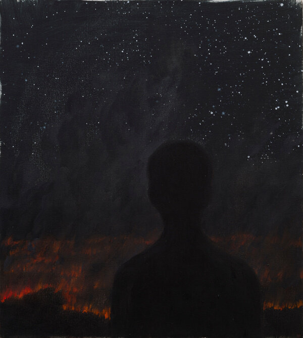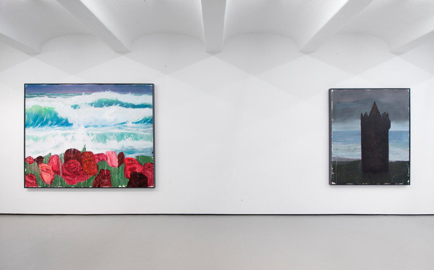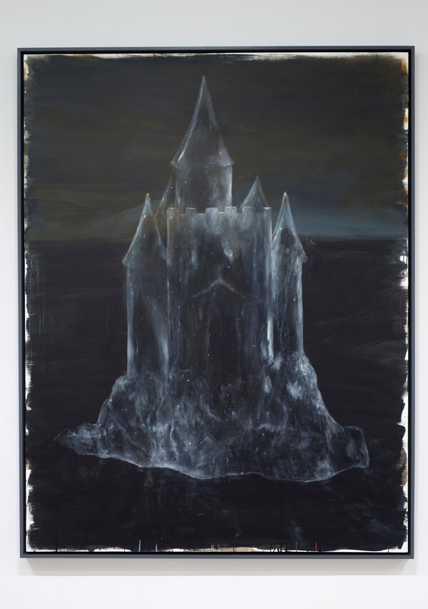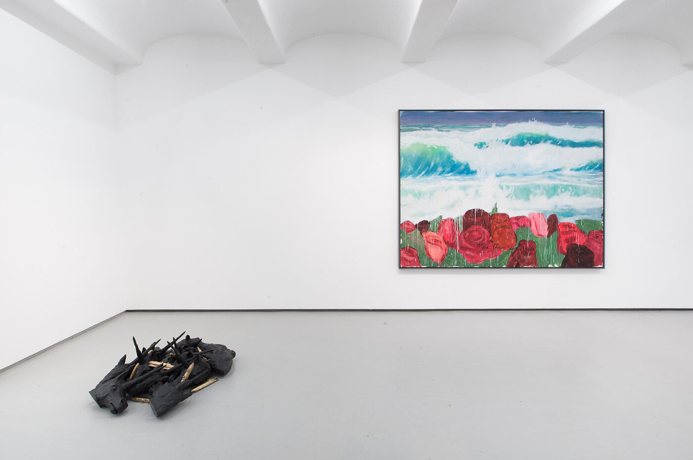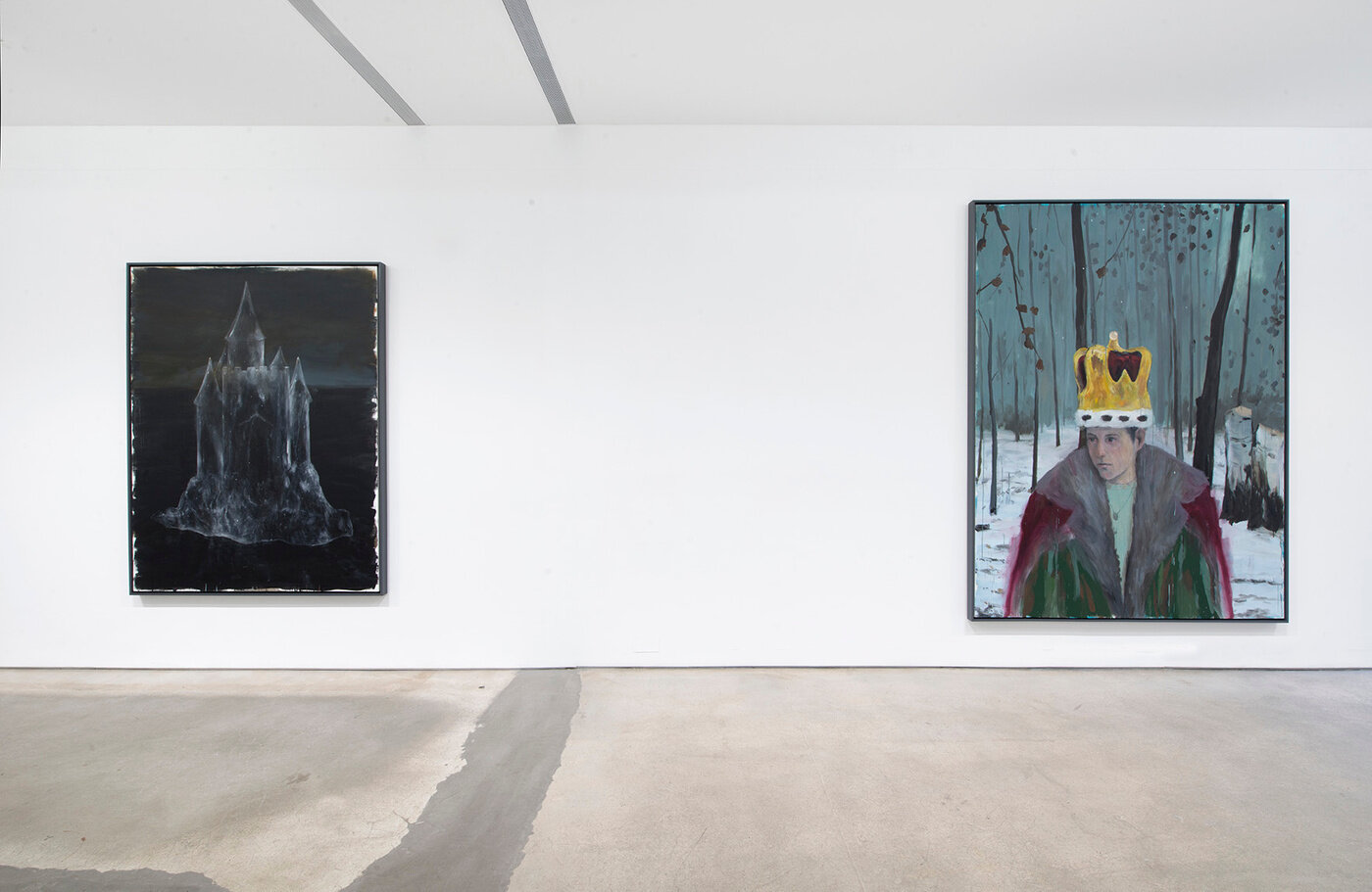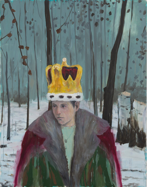If the broader concern of Empires is our inherent restlessness, revealed through our love, dreams, contentment, loneliness, nostalgia, and despair, the fundamental motivation is the confrontation of being and time. In this exhibition, land is a metaphor for what is known or at least imagined to be knowable. It becomes a site of embarkment as well as a destination. In The Crown, a boy king swallowed by a too-large crown is seemingly overwhelmed by new responsibilities. The boy is the counterpoint for an older man who appears in The Dreamer in the stance of power but naked, the vulnerability of his flesh contradicting the forcefulness he exudes. Here, land becomes a stand-in for the past and for the future: an embodiment of the tension between an identity or a home that is familiar and one that is strange, yet in which we hope to settle someday. The sea, on the other hand, is seen as substantially secret, facilitating the journey while threatening to swallow us into its watery heart. In The Beginning an almost imperceptible black pool spreads on the surface of an already dark sea. It is not apparent whether it is a substance, a shadow, or the evidence of something lurking below. This nebulous depth is complemented by The Bloom, for the Wilderness a painting of another type of surface, disturbed and tempestuous, crashing onto roses ambiguous in scale.
