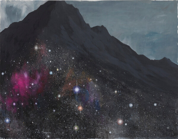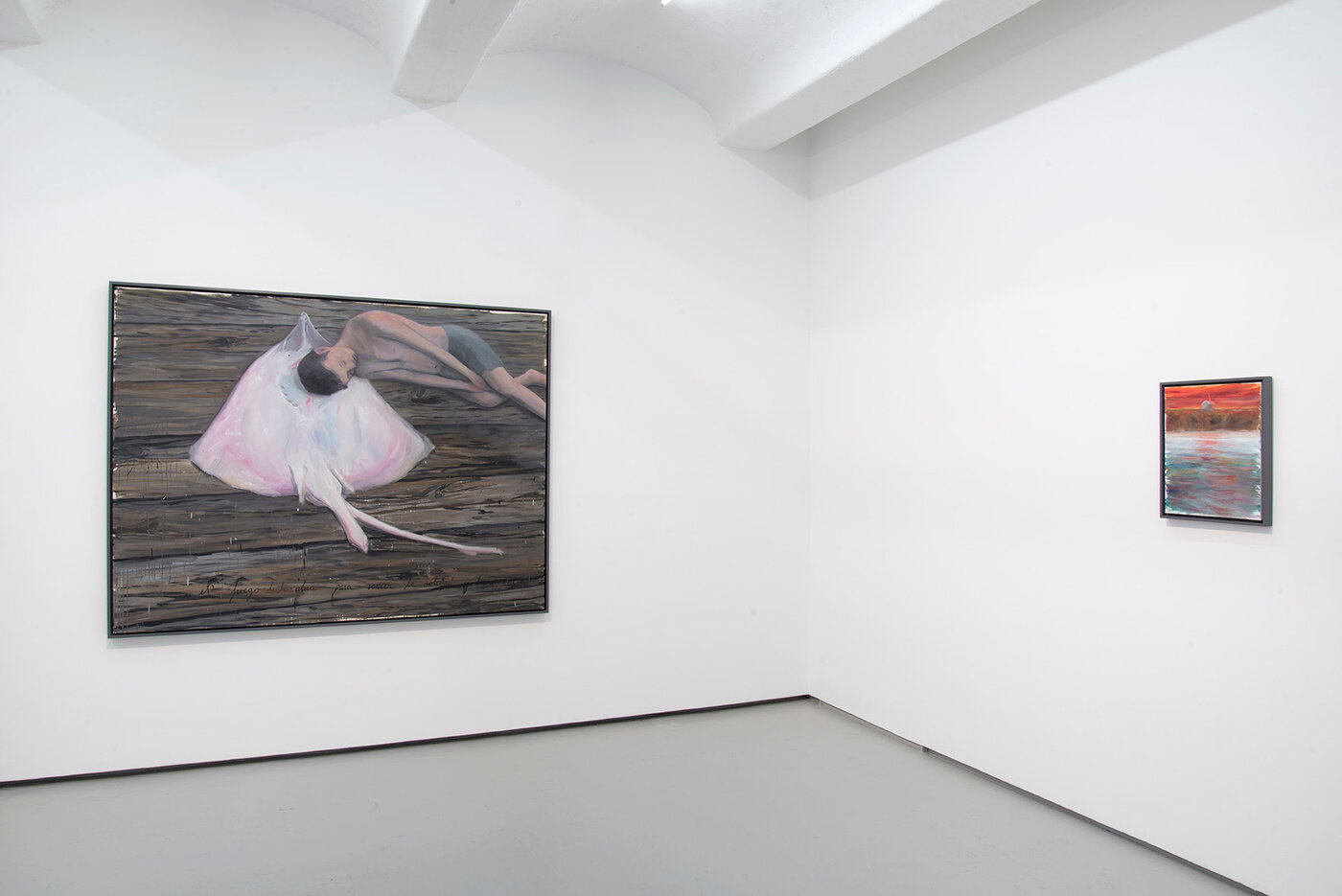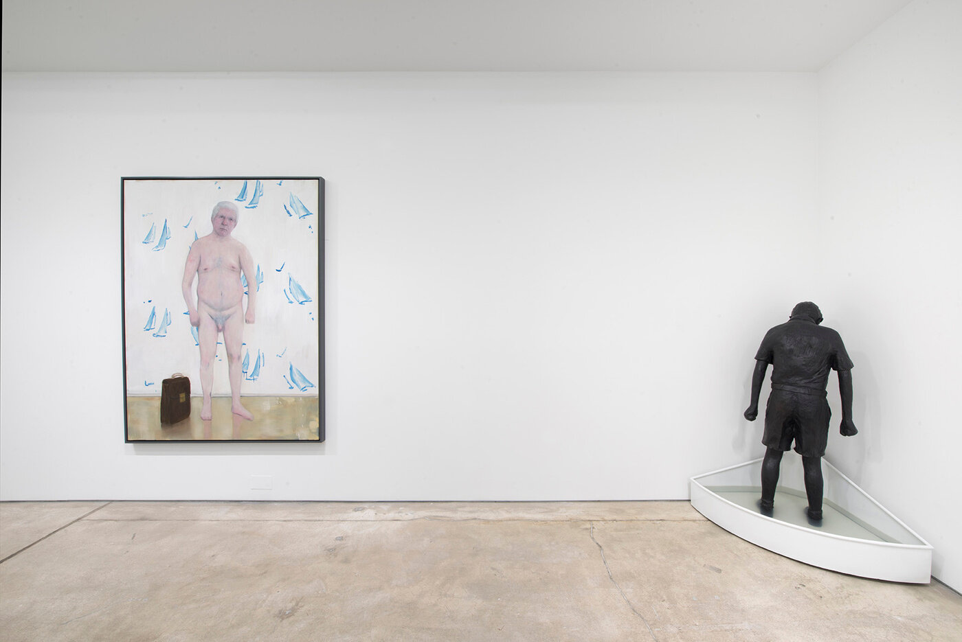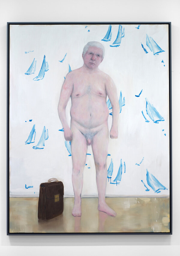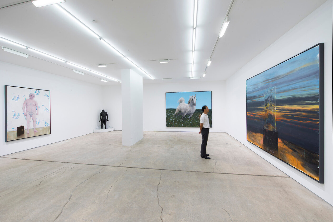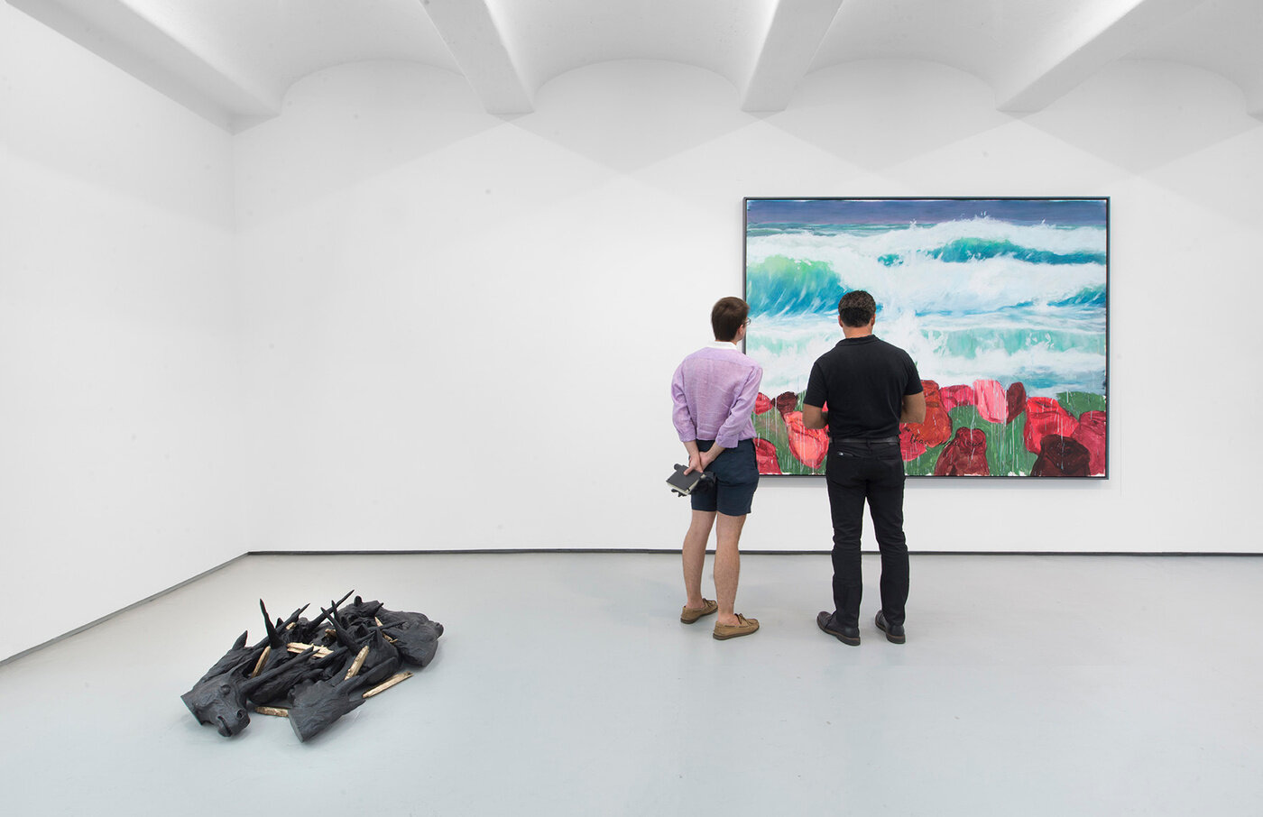 If the broader concern of Empires is our inherent restlessness, revealed through our love, dreams, contentment, loneliness, nostalgia, and despair, the fundamental motivation is the confrontation of being and time. In this exhibition, land is a metaphor for what is known or at least imagined to be knowable. It becomes a site of embarkment as well as a destination. In The Crown, a boy king swallowed by a too-large crown is seemingly overwhelmed by new responsibilities. The boy is the counterpoint for an older man who appears in The Dreamer in the stance of power but naked, the vulnerability of his flesh contradicting the forcefulness he exudes. Here, land becomes a stand-in for the past and for the future: an embodiment of the tension between an identity or a home that is familiar and one that is strange, yet in which we hope to settle someday. The sea, on the other hand, is seen as substantially secret, facilitating the journey while threatening to swallow us into its watery heart. In The Beginning an almost imperceptible black pool spreads on the surface of an already dark sea. It is not apparent whether it is a substance, a shadow, or the evidence of something lurking below. This nebulous depth is complemented by The Bloom, for the Wilderness a painting of another type of surface, disturbed and tempestuous, crashing onto roses ambiguous in scale.