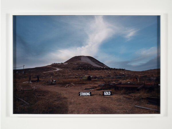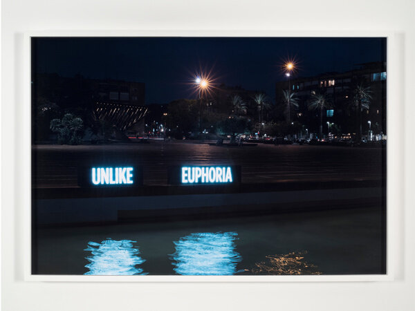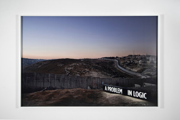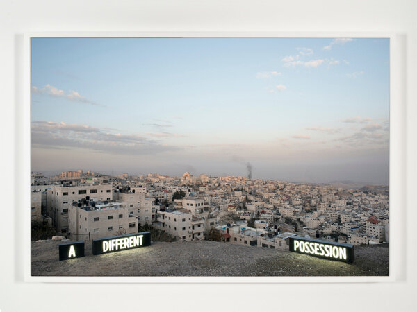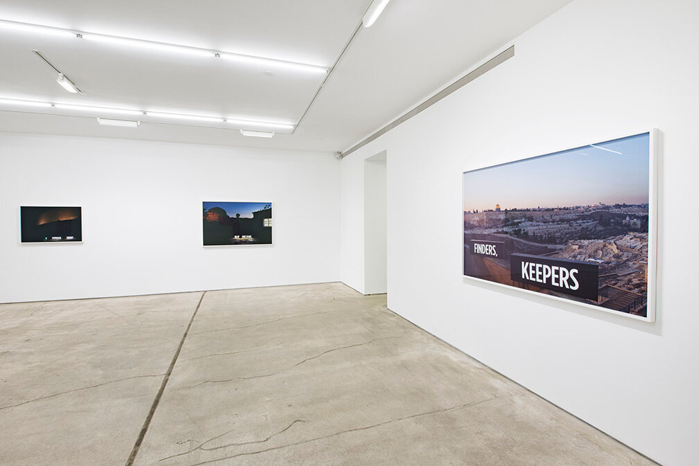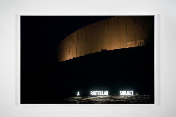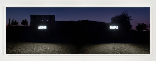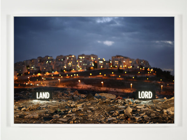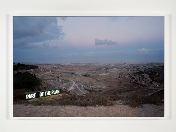 In 2014, Attie inserted approximately thirty custom light boxes of illuminated text into the contested landscape to produce site-specific installations staged specifically to be photographed. The glowing words both comment on the surrounding region and literally illuminate it, while additionally suggesting the inability of text and image to fully convey meaning.