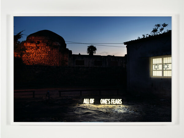 Rich with ambiguity, the phrases—some culled from the history of Zionism, others artistic distillations—resist interpretation, while pointing to some of the psychological, cultural, and political anxieties at stake in present day Israel and Palestine. Conceptually layered and visually arresting, these immersive images offer opportunities for reflection, while raising as many questions as they answer.