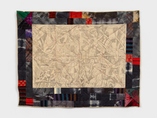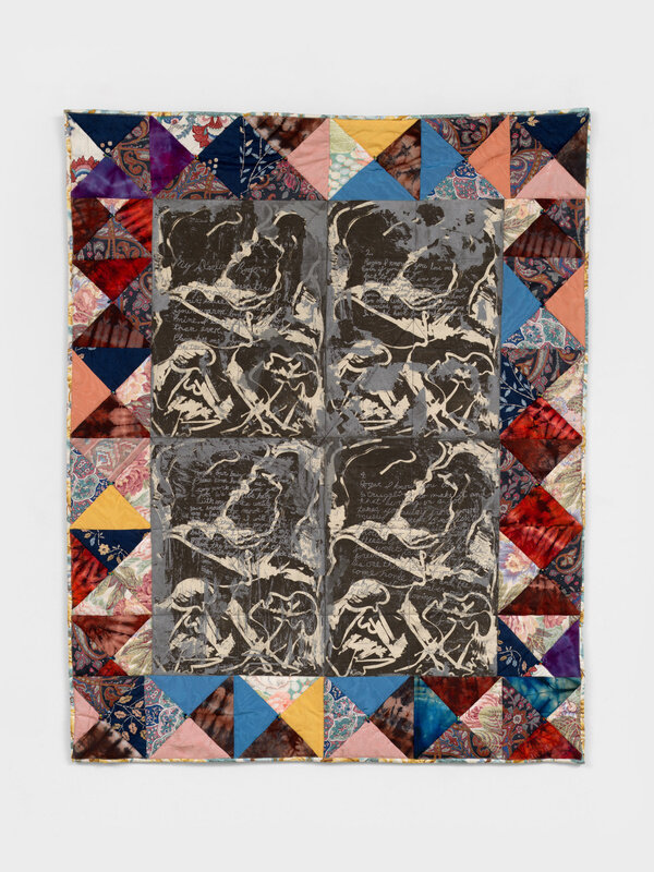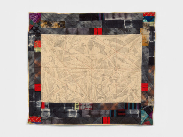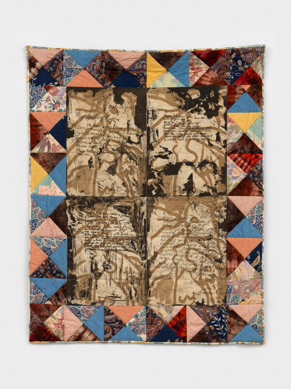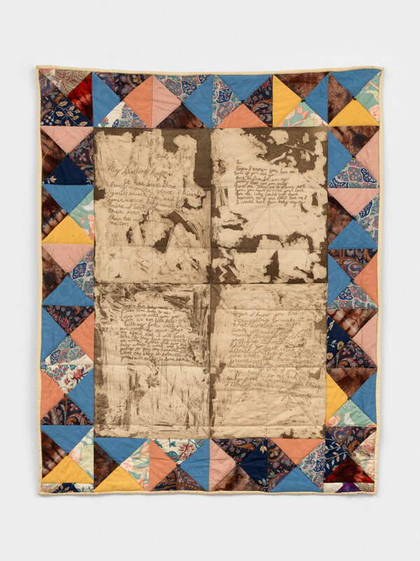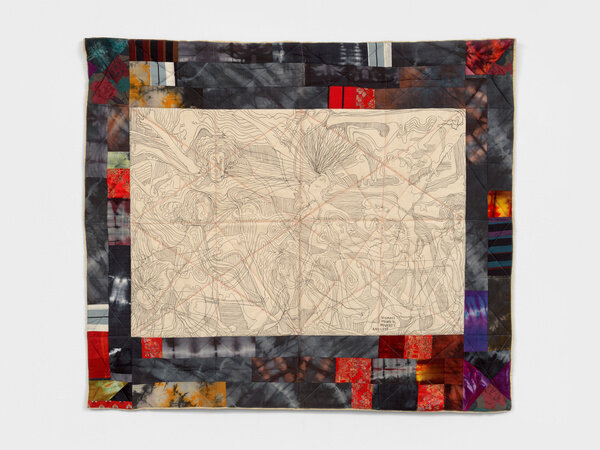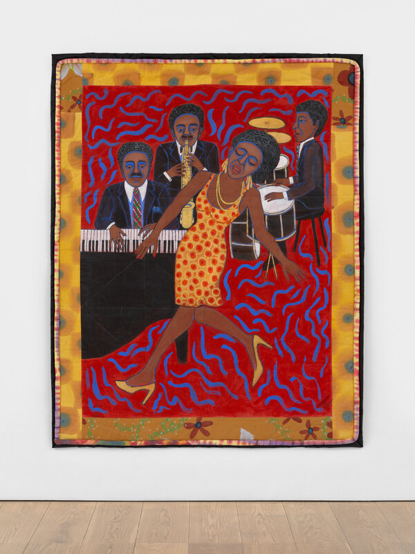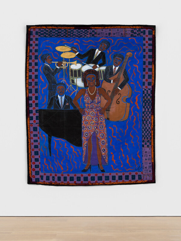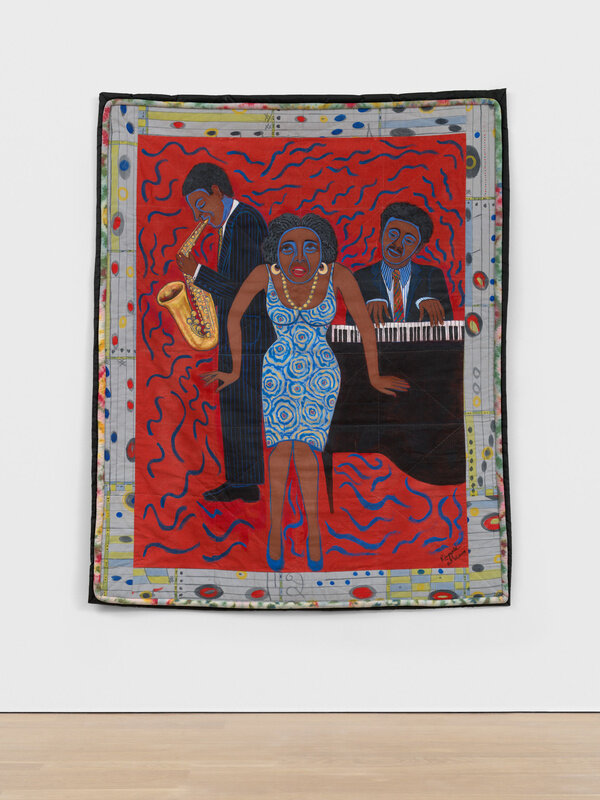 Ringgold’s later development of the story quilt in the 1980s both allowed her to work at successively larger scales and to connect with a global lineage of feminine creativity. Regularly combining her autobiography with scenes and episodes from the collective history of Black life in America, the story quilts are disarmingly intimate yet historically grand. The malleability of the form gave her the freedom to move between abstract and experimental series—such as the Politically Correct Sheets and Love Letters that she made in 1987—and more narratively grounded and figuratively descriptive ones, such as the Jazz Stories quilts made between 2004-2007.