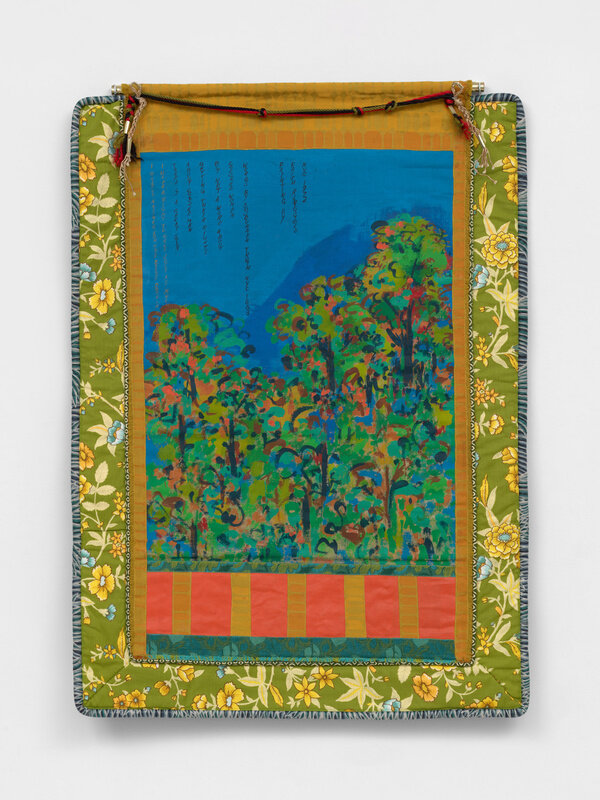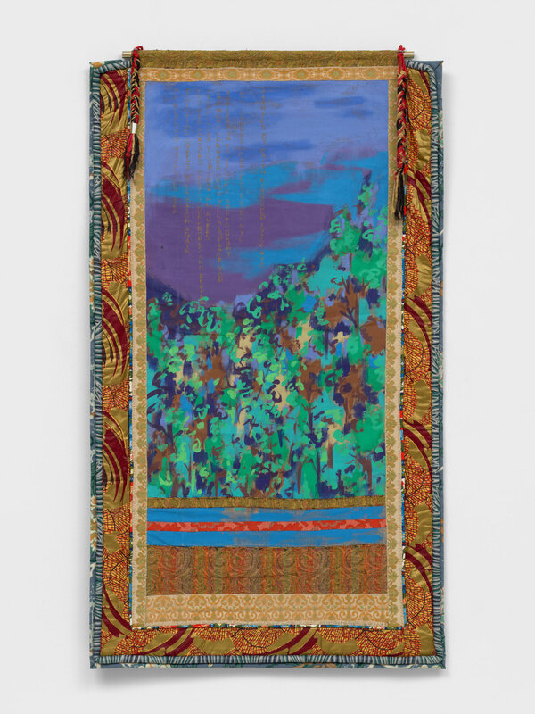 Ringgold’s first tankas, the Feminist Series (1972), feature lush and vividly colored forest scenes paired with hand-painted quotations by Black female abolitionists and Civil Rights leaders. The format inspired her to create Political Landscapes and Love Poems, two series of works on paper from the same year that were odes to her experiences utilizing her own words. These were followed by the Slave Rape Series (1973), in which Ringgold used the likenesses of herself and her daughters to embody the experiences of enslaved women—an act of both identification and reclamation.