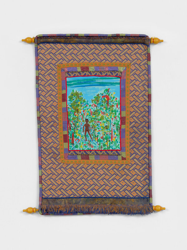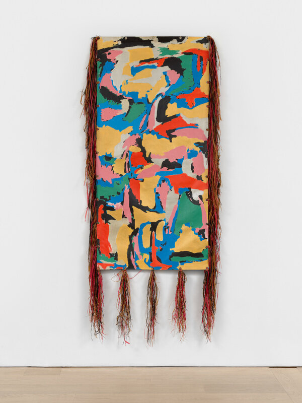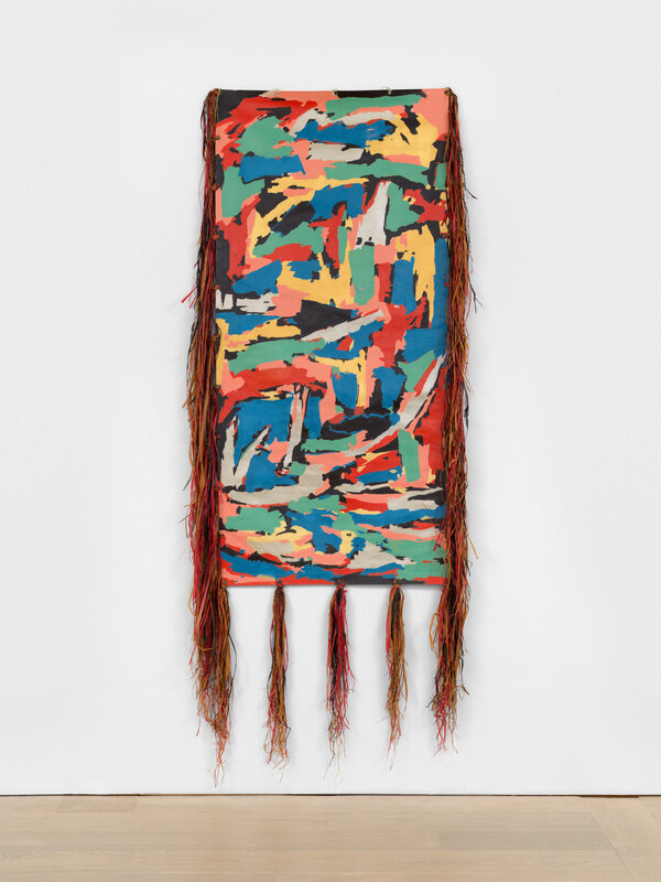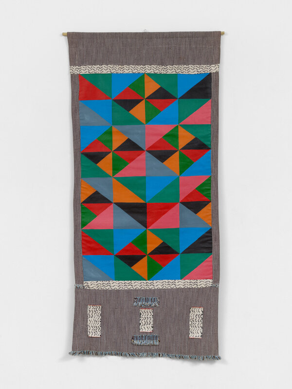 Pushing the tankas into an increasingly abstract direction, Ringgold developed the Window of the Wedding (1974) series, a collaboration with her mother Willi Posey. Inspired by Kuba textiles, these abstract compositions were conceived as hanging prayer rugs intended to bring happiness and protection to married couples. Perhaps Ringgold’s most formally daring tanka works—a series of paintings with raffia fringe titled California Dah—were made in response to her mother’s passing, attempting to bridge the gap between the earthly and the afterlife.