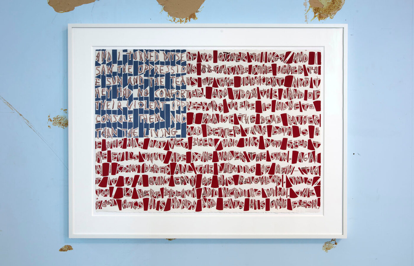 Feedback is filled with art works by artists who I’ve been following for a while. In other words, artists I “like” and who I have asked to gather together today to form an assembly, a class, a chorus. I was curious about what kind of knowledge we might be able to produce together. Some of the artists are interested in the twisted history of America. Others are interested in the persistence of quotidian pleasures as best exemplified by still life or contemporary tableaux of everyday life. Some artists have combined their sense of America’s untold narratives with the gentle ebb and flow of daily life. Some are sharing their daydreams, others their nightmares. Everywhere there is attention to craft, the handmade, the body. Each artist plays with the building blocks of visual art: color, light, shape, texture, material, improvisation, form. Together, the works on view offer a microcosm, a snapshot in time, of the feedback loop that is culture—people make things that help us learn things, that allow us to think things, that help us to ask questions, that propel us to make things. Feedback plays with what happens when the eternal return of the same is also the eternal return of difference. (Oh say can you see, by the dawn’s early light…) Feedback toggles back and forth between the past, present, and the future (working to keep the cynicism at bay), by stoking the small and tender fires of each artist’s experience of the feedback loop called America.