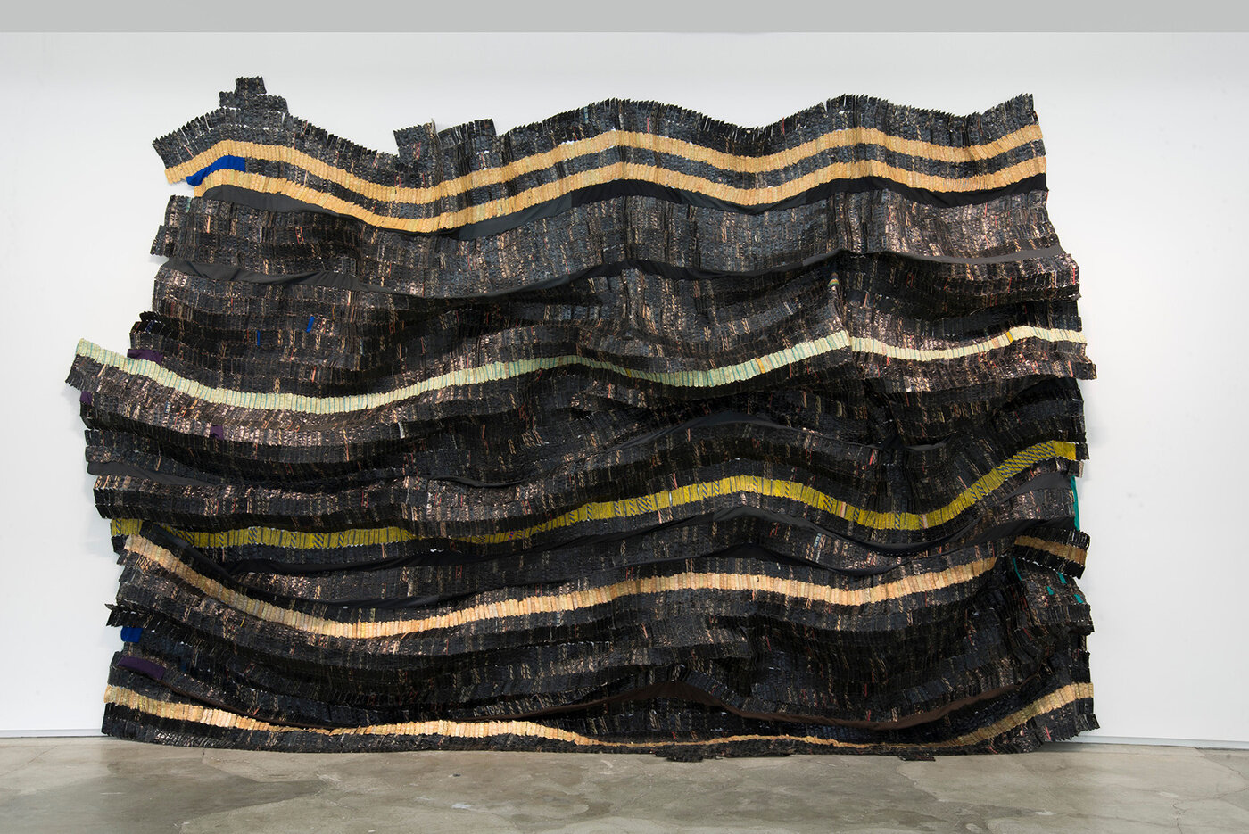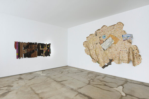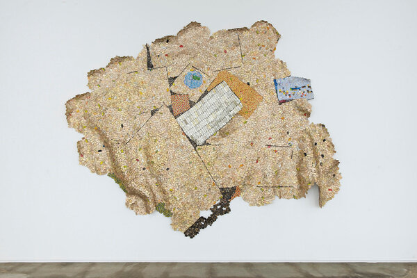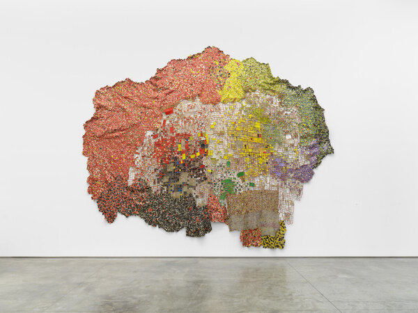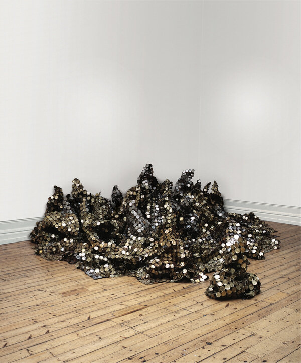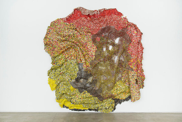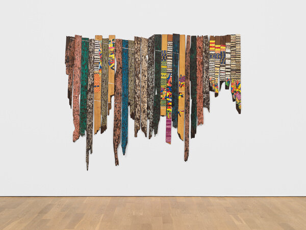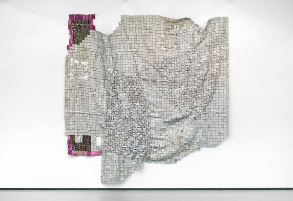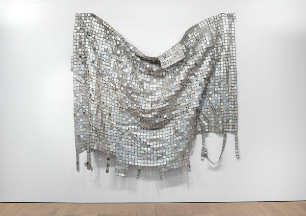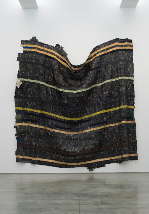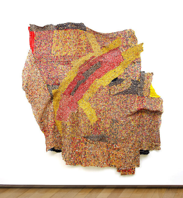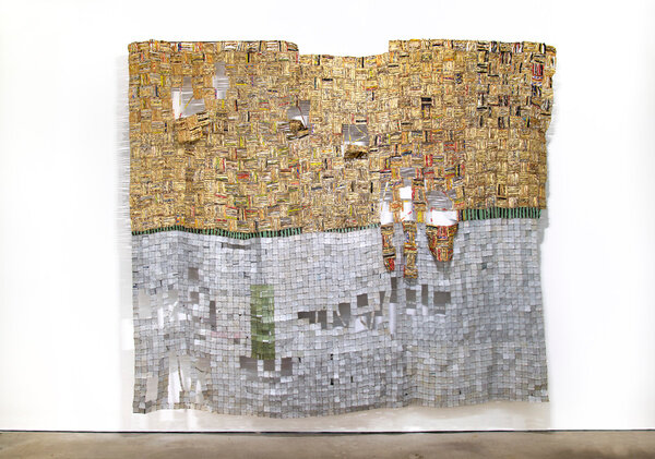 The tension between fragility and resilience inherent in the medium of clay, and the radical formal properties of the wood work, come full circle in the majestic metal wall-hangings for which Anatsui is best known. Meticulously assembled from discarded aluminum often sourced from liquor bottles, the recycled materials coalesce in exquisite constellations that track postcolonial exchange and global abstract traditions. Stressed World, 2011 is a quintessential example: delicate yet monumental. Hovering between sculpture and painting, the metal constructions defy categorization and have solidified Anatsui’s status as a groundbreaking visual artist of international critical acclaim.