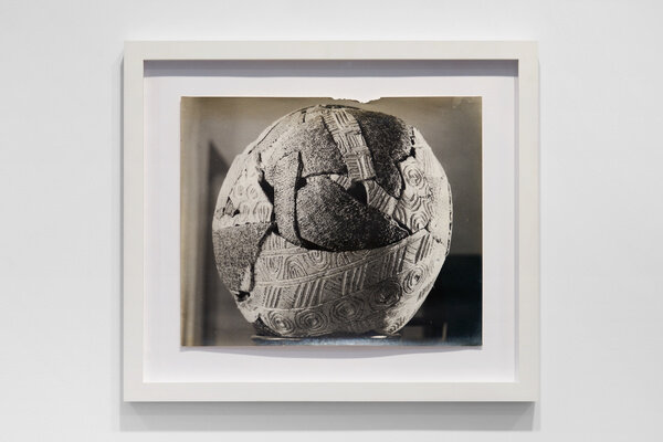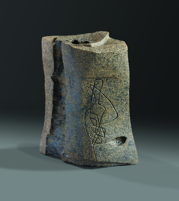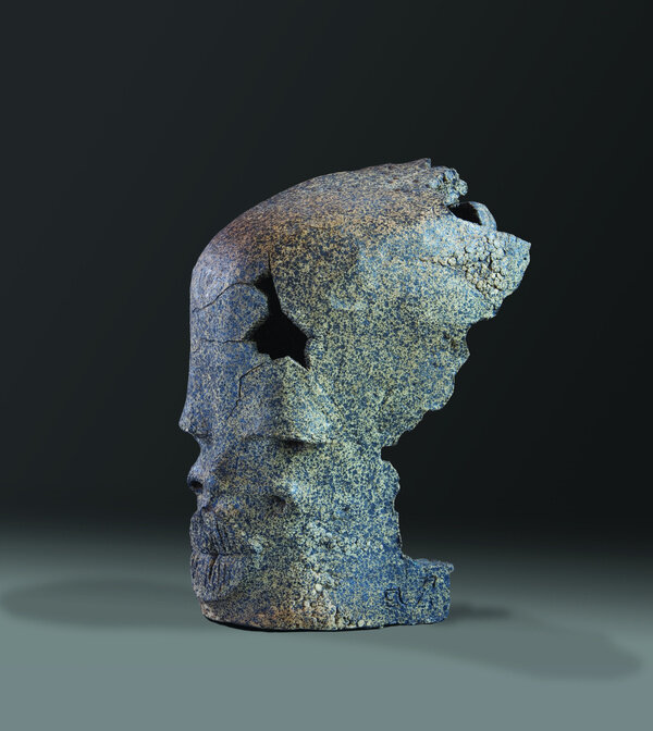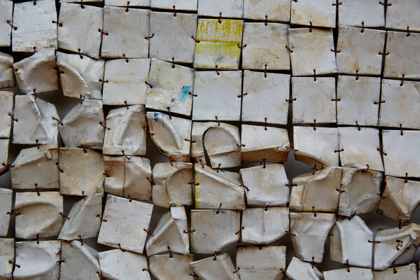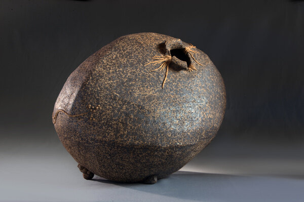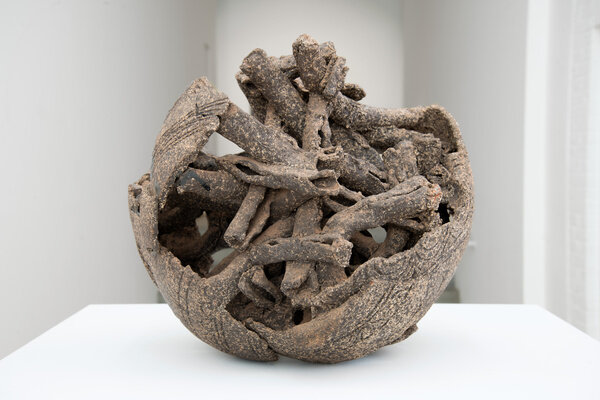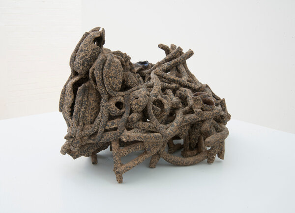 The earliest work in the exhibition dates from the late 1970s when Anatsui began his tenure as a professor of art at the University of Nsukka, Nigeria. Selected clay sculptures from The Broken Pots series, 1977, line the perimeter gallery. While the goal of much pottery is utilitarian, these cracked and chipped ceramic and manganese vessels deny their usability. They are broken and reconfigured, much in the way that individual remembrances can be reconstructed to resurrect collective history. In Chamber of Memory, Anatsui references traditional Nigerian terracotta, and fashions tiny pockets inside the skull-like form to convey the object as a site of lasting historical and cultural memory. Placed on pedestals, the series demonstrates even a small fragment can have tremendous resonance.