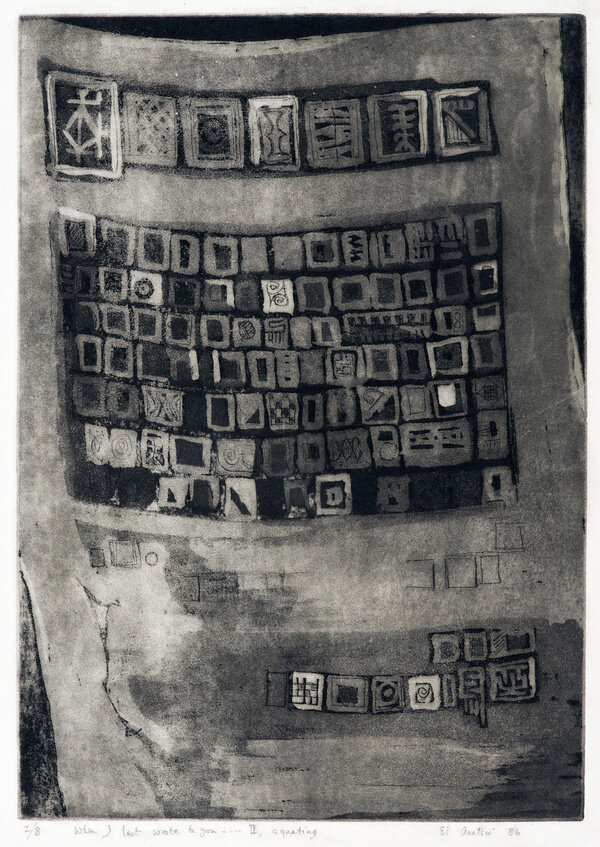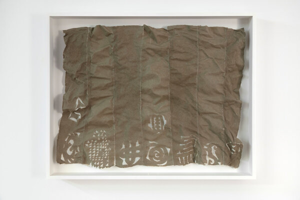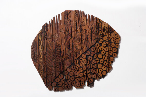 Sculptures in wood dominate much of Anatsui’s artistic output from the 1980s and 90s. Works from this period, such as Assorted Seeds II, 1989, with their heavy intaglio lines and subtle gradations in color, find kin in the bold-banded acrylic paintings and etchings from the same time. Later forays in wood incorporate intricate saw marks (Fan, 1995) and flashes of colorful paint (Old Cloth Series, 1993).