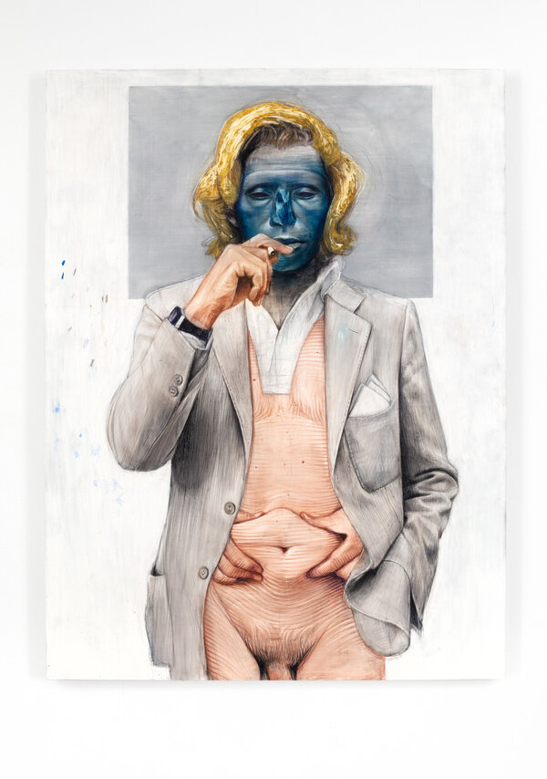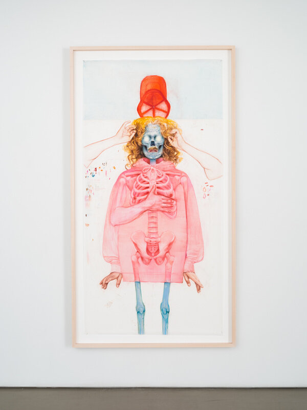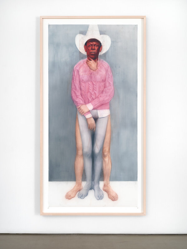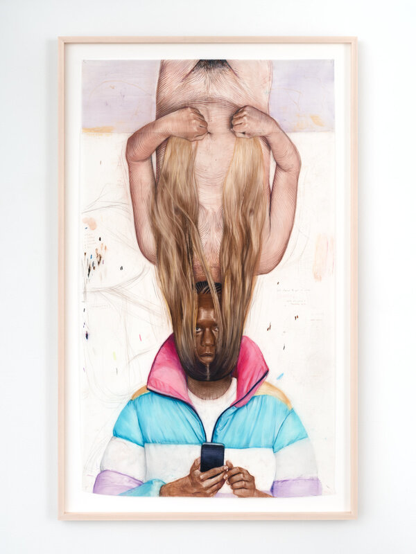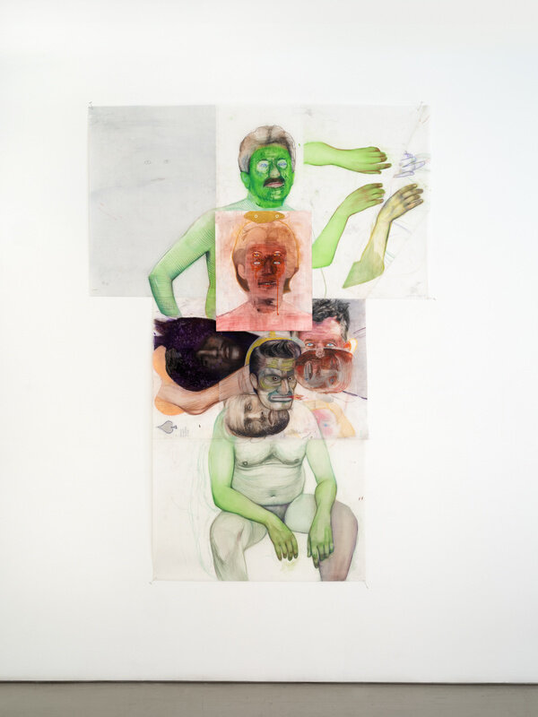 In this new series of often larger than life-size watercolor pencil drawings on mylar, Geoffrey Chadsey’s subjects present themselves to the viewer nude, like an artist’s model, or naked, in a state to be desired. Each body is ruptured with a kind of gender melancholy that is performed through incoherent, mutating selves. Rendered on mylar, Chadsey plays with this surface that allows his liquified marks to move around like paint while emitting the plastic sheen of a photograph. Lines wrap the subjects’ bodies, challenging physical dimensionality and mimicking anatomical etchings. These works are created from looking at vast and varied collections of photographs, and in turn, reproduce the dynamic of a photo shoot: a subject presenting themselves to the lens, either being photographed by someone, or by themselves, to be presented to another.