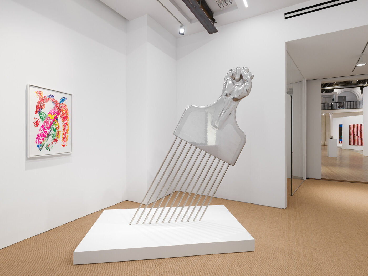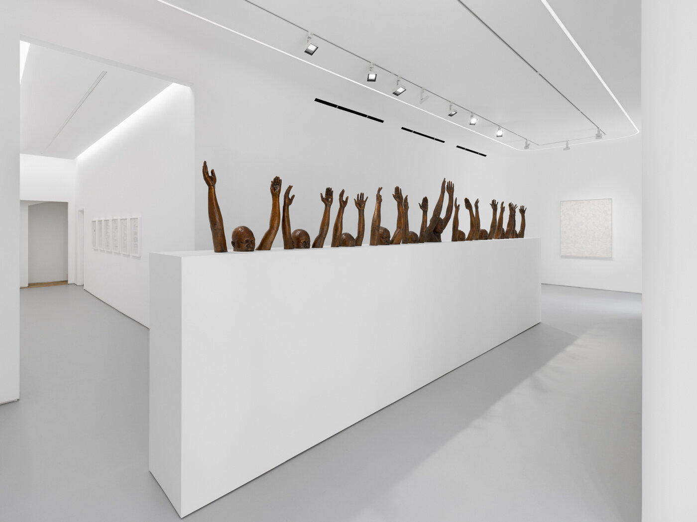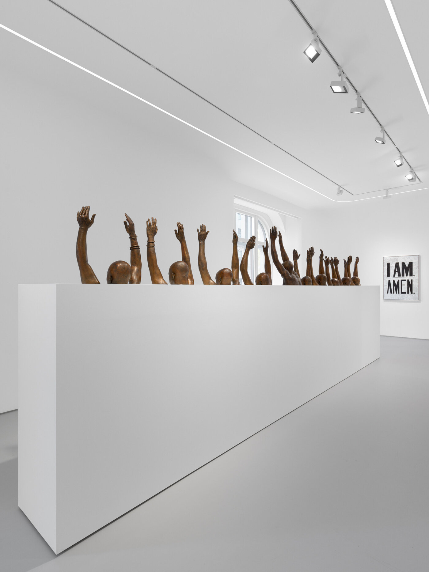 Sculpture continues to be a vital mode of public engagement for Thomas, providing him with opportunities for building community through shared experience. His punctum sculptures take inspiration from Roland Barthes’ photographic theory which describes a detail or passage within an image—the ‘punctum’—that emotionally resonates, sticks with or ‘pierces’ a viewer. Originally sourced from archival photographs, Thomas has begun to use more universal gestures in his newer compositions, as in Community (2024), where isolated hands linking with arms create a circle of power that conveys love, support and connection. In E Pluribus Unum (2020), an eight-foot stainless steel arm points towards the sky with strength while incorporating viewers into its brilliant reflective surface. The nature and scale of these sculptures mirrors their varying iterations in public spaces nationwide while also speaking to Thomas’ longstanding commitment to reconciling the effects of the past on our present moment in history.