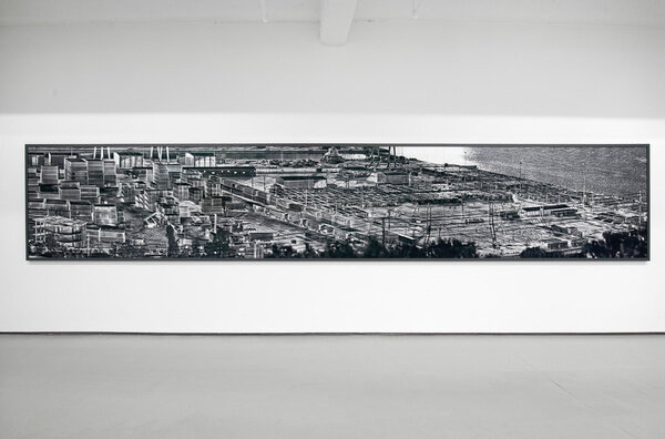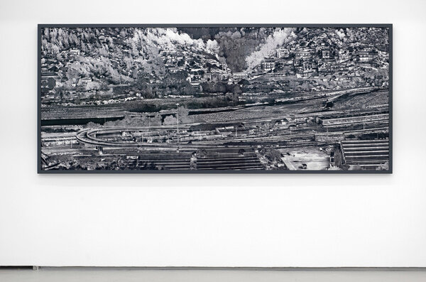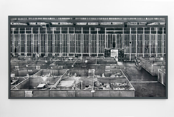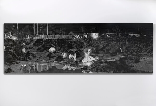 By attaching the camera to a robotic motion-control tripod, Mosse has scanned significant sites in the European refugee crisis from a high eye-level, creating densely detailed panoramic thermal images. Each artwork has been painstakingly constructed from a grid of almost a thousand smaller frames, each with its own vanishing point. Seamlessly blended into a single expansive thermal panorama, these images evoke certain kinds of classical painting, such as those by Pieter Bruegel or Hieronymus Bosch, in the way that they describe space and detail. They are documents disclosing the fences, security gates, loudspeakers, food queues, tents, and temporary shelters of camp architecture, as well as isolated disembodied traces of human and animal motion and other artifacts that disrupt each precarious composition and reveal its construction. Very large in scale, Heat Maps reveal intimate details of fragile human life in squalid, nearly unlivable conditions on the margins and in the gutters of first world economies.