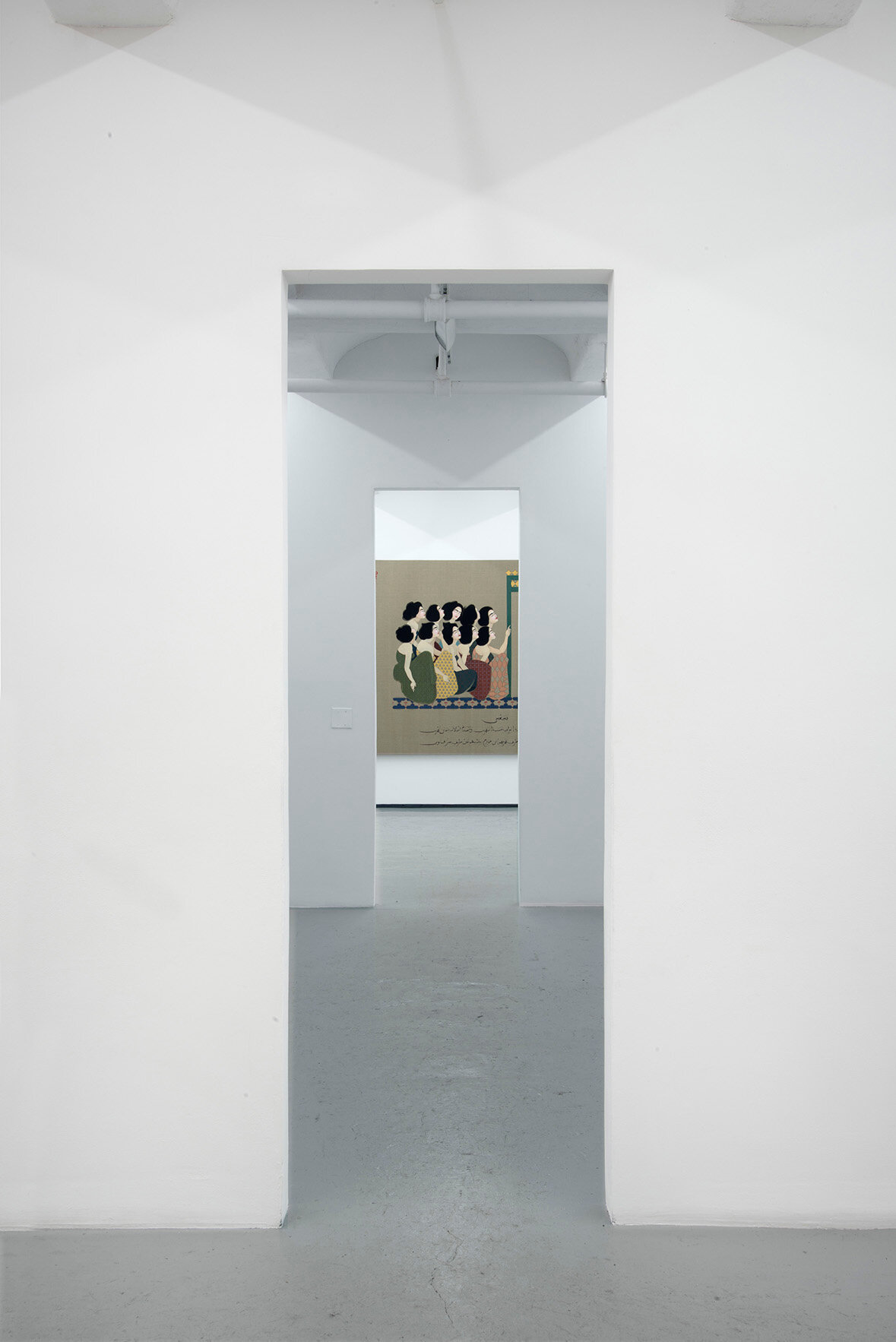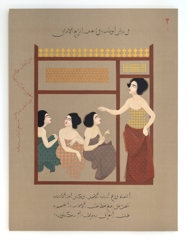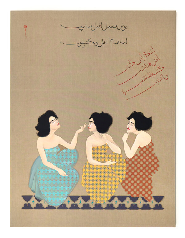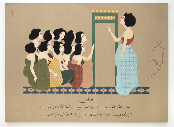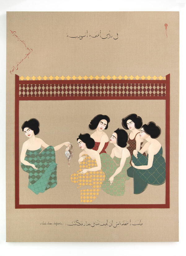 Kahraman modeled her new series after 12th century Arabic illuminated manuscripts—in particular, Maqamat al Hariri, an important canonical book, where the everyday life of Iraqis was portrayed with detail and care in images and text. The manuscript is, indeed, considered a major example of the Baghdad school of miniature painting that flourished in the 12th century and that was cut short by the Mongol invasion, which destroyed countless historical documents and books, and hence never developed further. It is, then, another instance of a larger loss that seems to be one of the major recurring themes in Kahraman’s oeuvre.