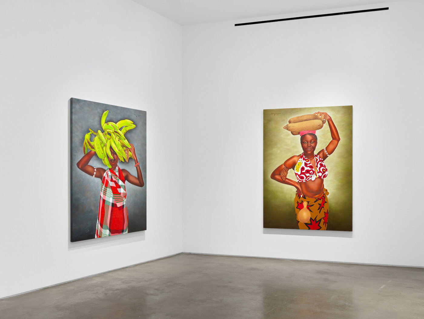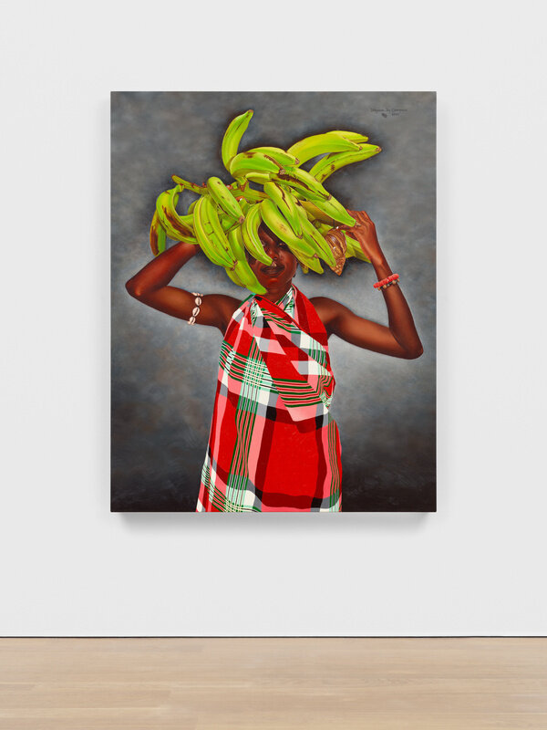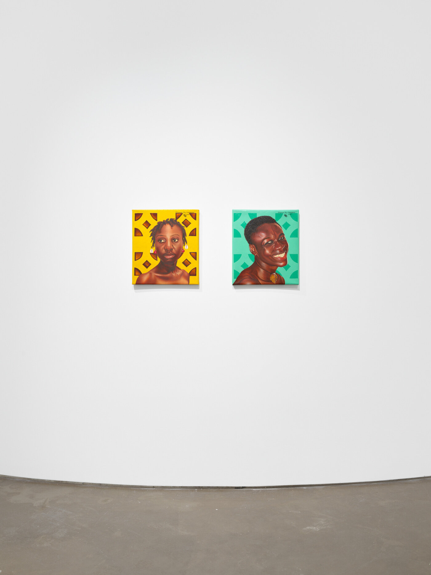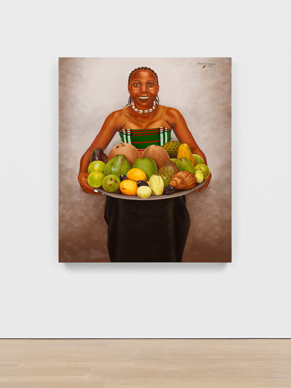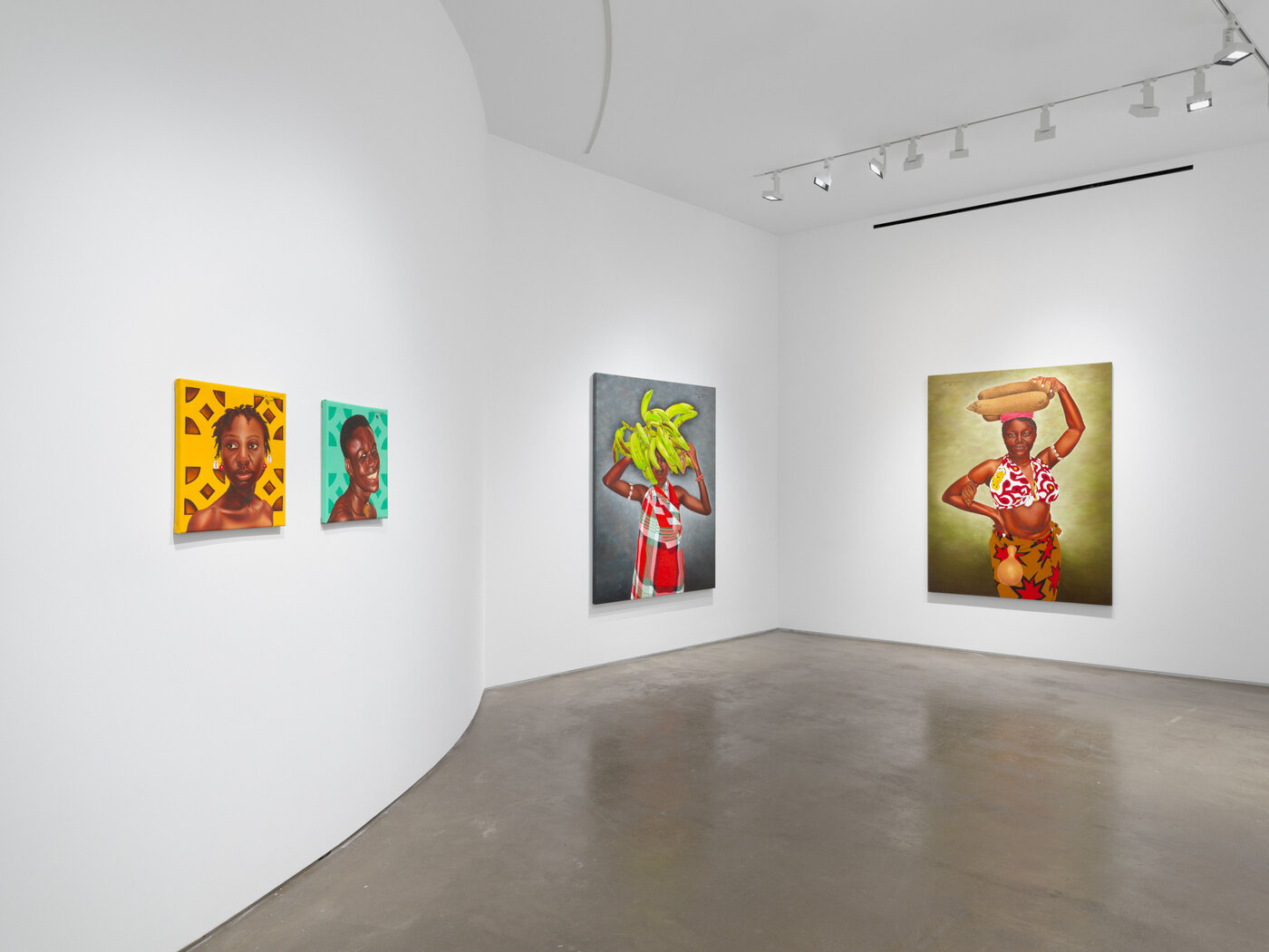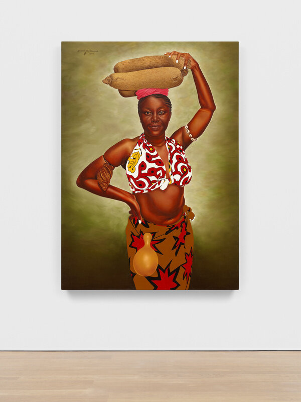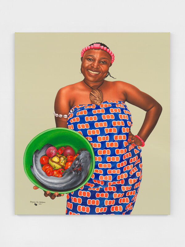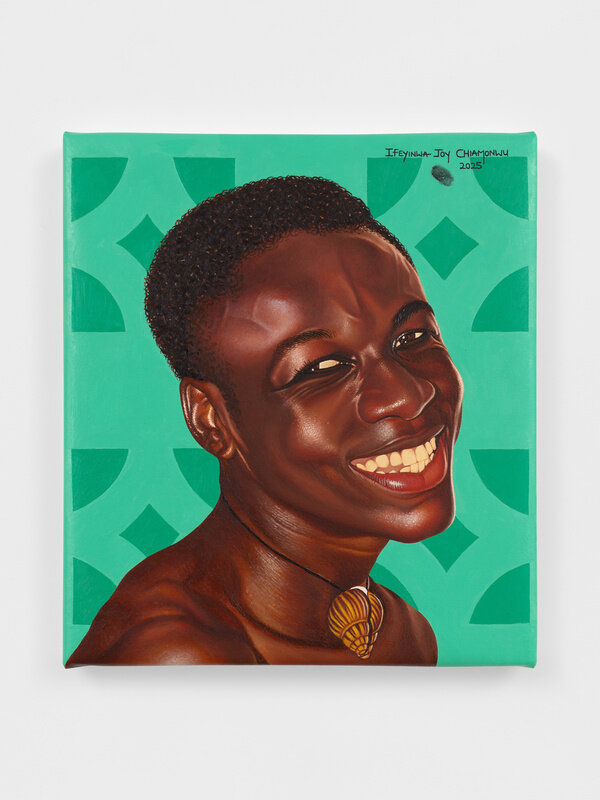 In “Nwanyi Mkpulu-Osisi” (The Fruits Woman) (2025), an overflowing plate of fruits and vegetables is carried towards us by a generous woman proud of the abundance in her hands. The sea shell at the edge of the plate that just nearly comes to the edge, signals an Igbo ritual of intergenerational connection, as these objects are passed down through time. The precision of these various forms unfolds against an evocative, nearly monochromatic background of grey and white, where Chiamonwu allows her hand to remain visible on the surface of the canvas. The portrait “Adaudo” (Daughter of Peace) (2025) depicts a woman gazing past us beyond the frame of the work, with the background behind invoking the architecture of Igbo homes.