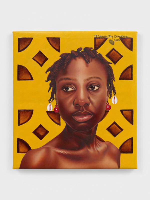 Ifeyinwa Joy Chiamonwu (b. 1995 in Maiduguri, Nigeria. From Anambra state, Nigeria; Lives and works in Anambra, Nigeria) is an artist whose work celebrates and preserves themes of tradition, culture, and family. Chiamonwu discovered her passion and talent for drawing and art at a young age, and went on to graduate from Nnamdi Azikiwe University with a degree in Education. Deeply committed to her Igbo heritage, Chiamonwu sees her work as an opportunity to not only preserve, but to also educate audiences around the world and give a voice to members of the community who feel they have lost their culture to the advance of technology and Westernization. Despite having no formal artistic training, Chiamonwu’s meticulously detailed use of charcoal, sepia, pastels, acrylic paints and coffee stains on paper and canvas, pushes the bounds of her mediums. Through this technique, Chiamonwu creates portraits of friends and family as mythical and historical characters, immortalizing the rich and eloquent histories, traditions, cultural values, myths, and the ethnic practices of the Igbo people of Nigeria, West Africa. Recent solo exhibitions include Ancestral Heirloom, Mattatuck Museum, Waterbury, CT (2023). Recent group exhibitions include From Cindy Sherman to Francesco Vezzoli: 80 Contemporary Artists, Palazzo Reale, Milan, Italy (2025); GENERAL CONDITIONS, The School, Jack Shainman Gallery, Kinderhook (2025) and Translations: Afro-Asian Poetics, The Institutum, Nouri, Singapore (2024).