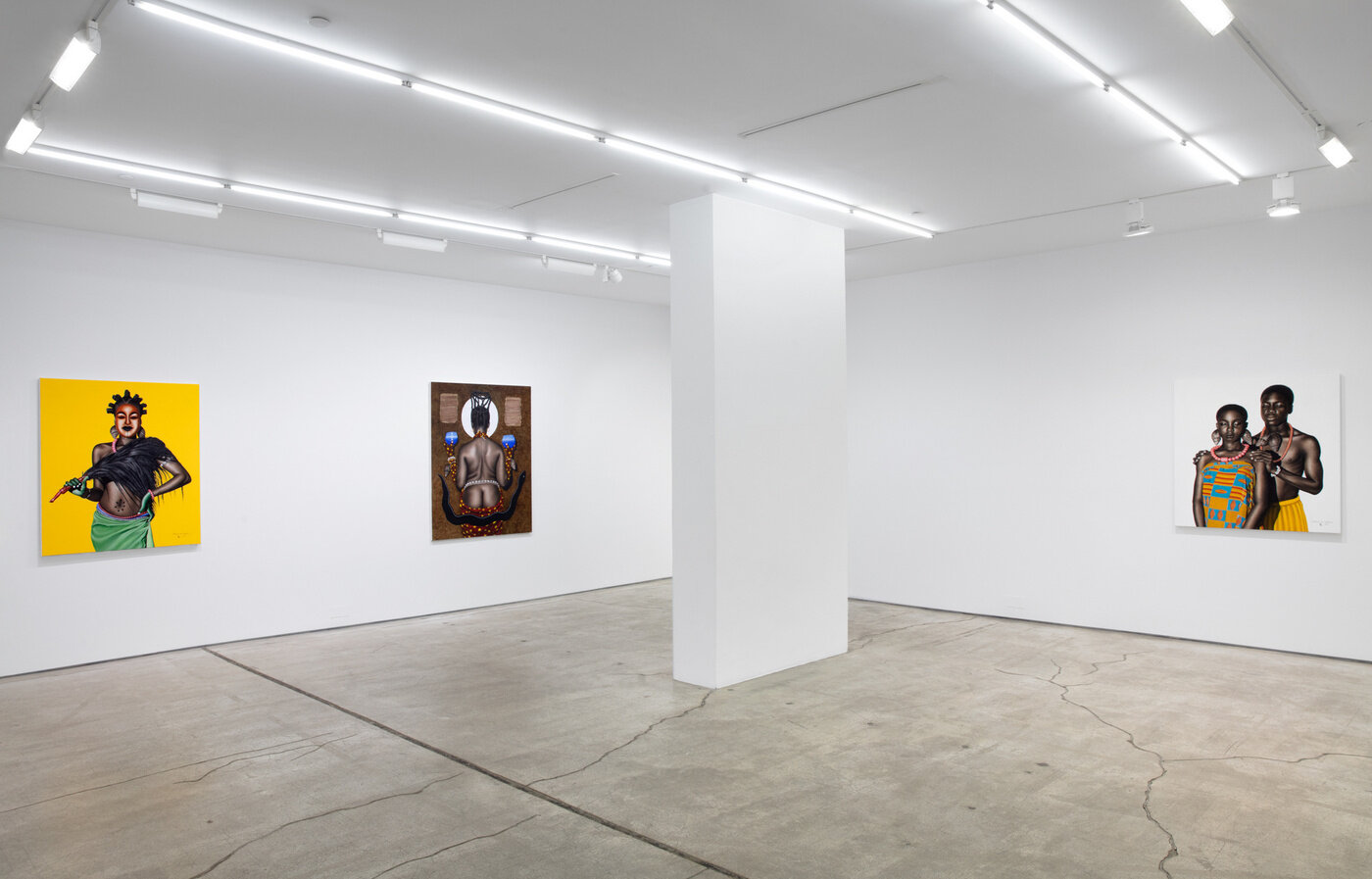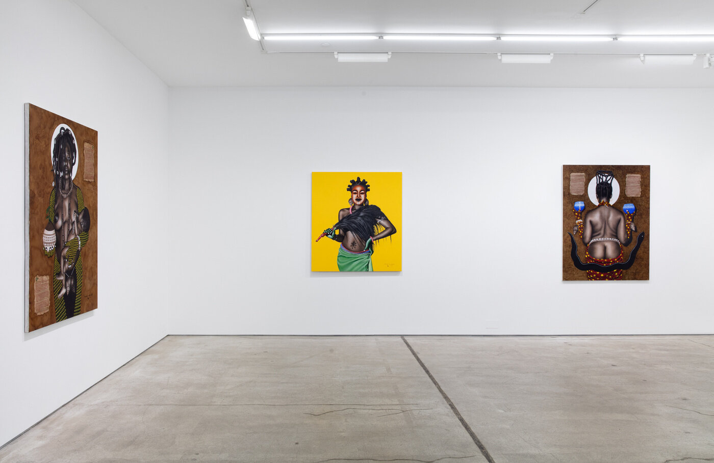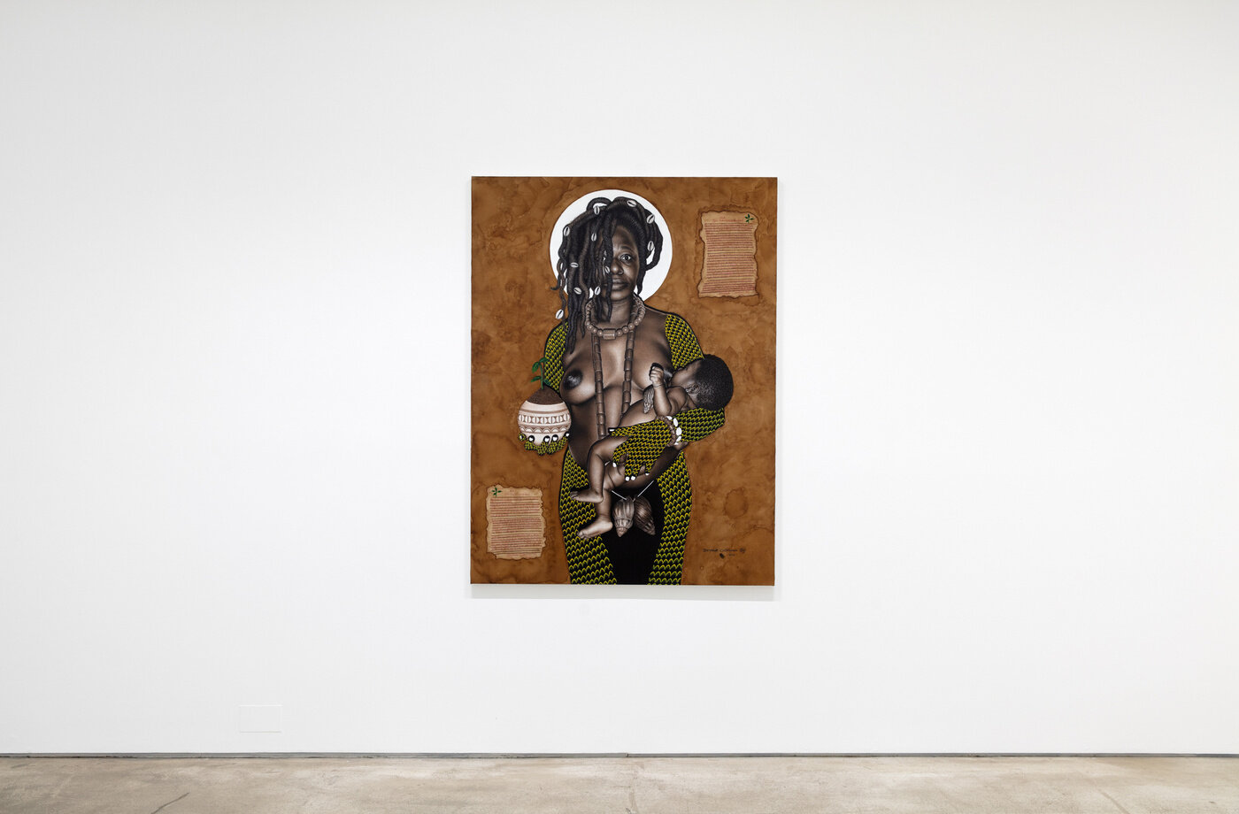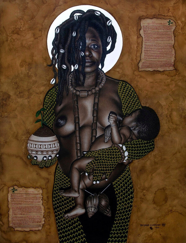 Growing up in the Anambra state of Nigeria, Chiamonwu was taught that tradition, community, and most importantly, family were values to be placed above all others. Chiamonwu has chosen to highlight these same priorities in Genesis, her first solo exhibition, a grouping of works on paper and canvas showcasing her family members and close friends as representations of mythological Igbo deities, customs, and cultural beliefs both past and present.