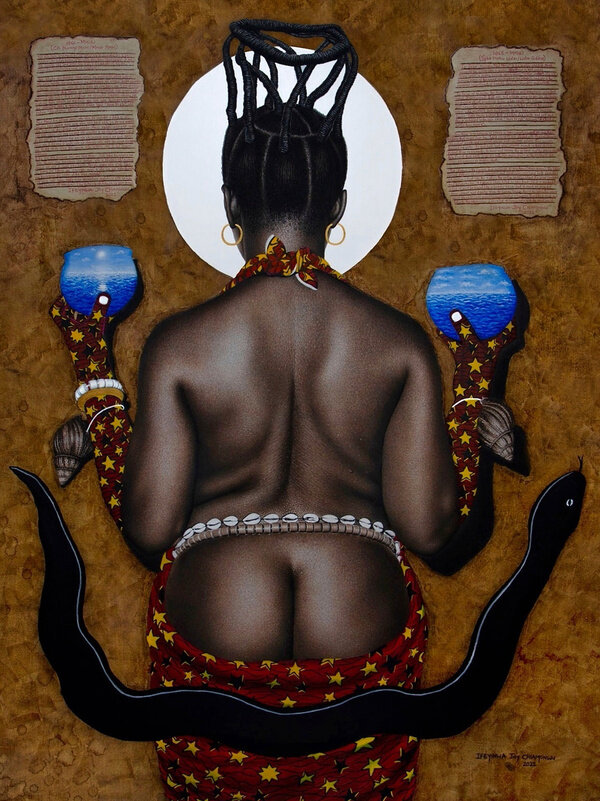 Paintings like Nne Mmiri (Igbo Water Goddess) demonstrate the kinds of rich myths and histories that Chiamonwu seeks to embody. As queen of the marine world, Nne Mmiri is thought to be the embodiment of beauty, fertility, and wealth. She holds her realm in her hands, sparkling and beautiful with vivacity. Accompanying her is a python; her messenger and a symbol of her strength. Along with Igbo deities, Chiamonwu also portrays quieter, more domestic aspects of her culture, such as in Umunne (Siblings). Featuring her own brother and sister as models, she contrasts their brightly colorful Ankara wrappers and adornments with the serene composure of her siblings. Most striking is the sense of their ease, contentment, and security with each other, in a way that often only comes from a life-long, nurtured bond.