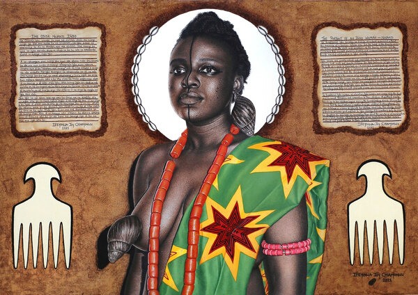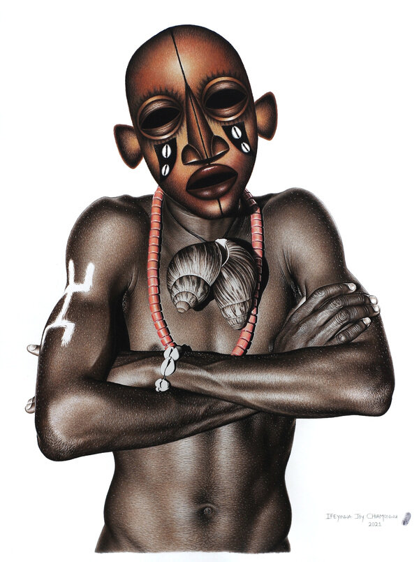 Born in 1995, Chiamonwu recounts witnessing the recession of many of her close-knit, Igbo community’s tribal traditions and cultural practices, and in response has shaped her practice in order to preserve them. The range of Igbo identities worldwide is vast, and Chiamonwu has chosen to focus her expression on the kinds of physical, tribal objects and cultural figures that played such a large role in her childhood and are close to her heart when she thinks of her community. Over the years she has made an effort to spend time with local elders; to listen to and protect their stories through her artwork so that she can subsequently share them with this and future generations, locally and around the world.