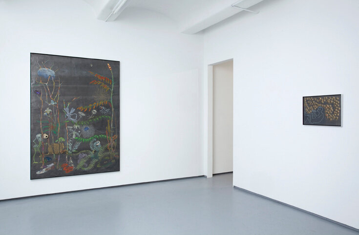 Using lead, collected objects, oil paint, stamps and printed material, Vega maps out a surreal and wondrous reality where social and metaphysical spaces are intertwined. Vega has adopted lead as a physical and conceptual support, playing with its malleable and mercurial nature. With each punctuation, the lead grows and swells and with every marking, the surface takes on a newly reflective position.