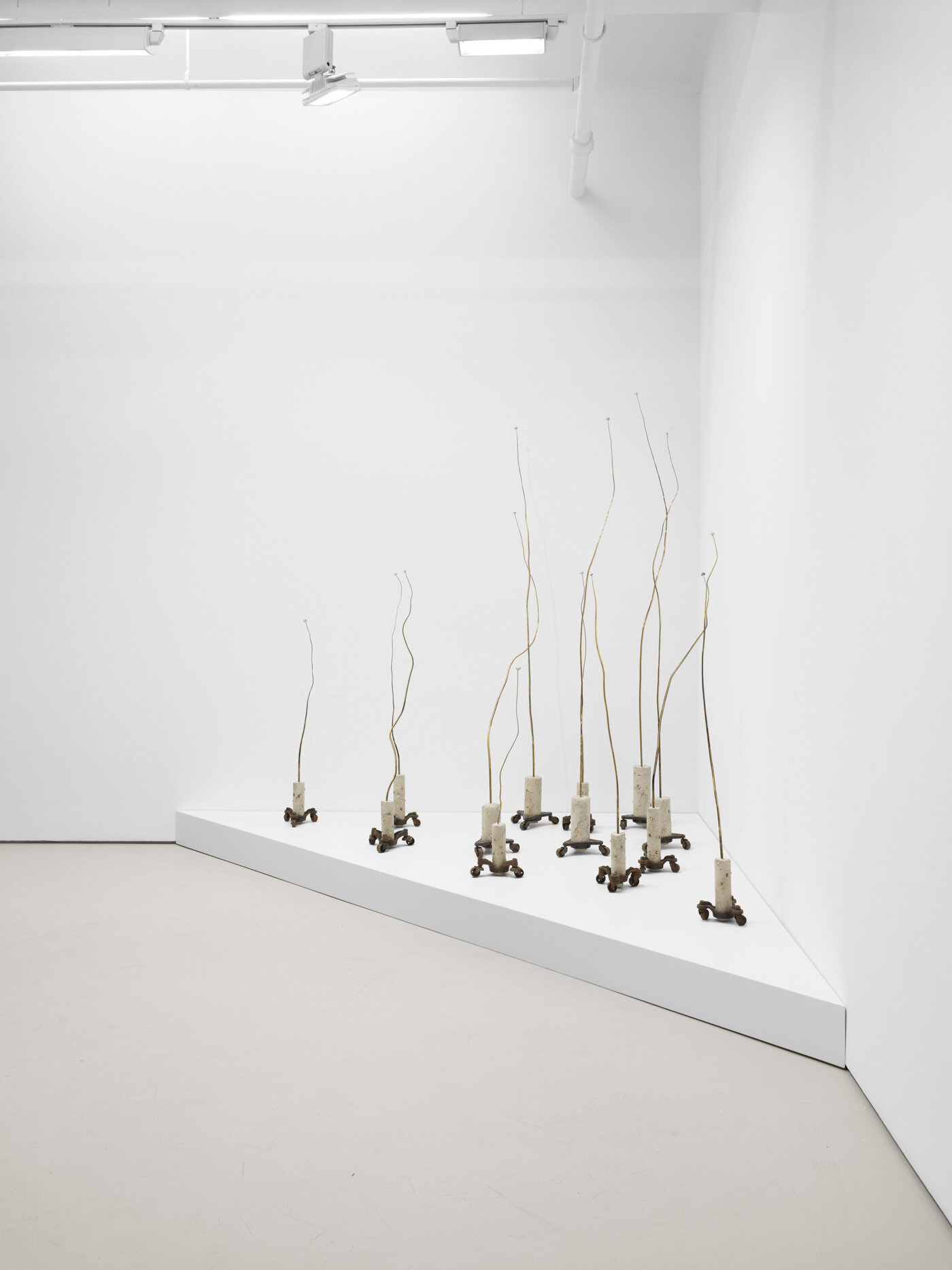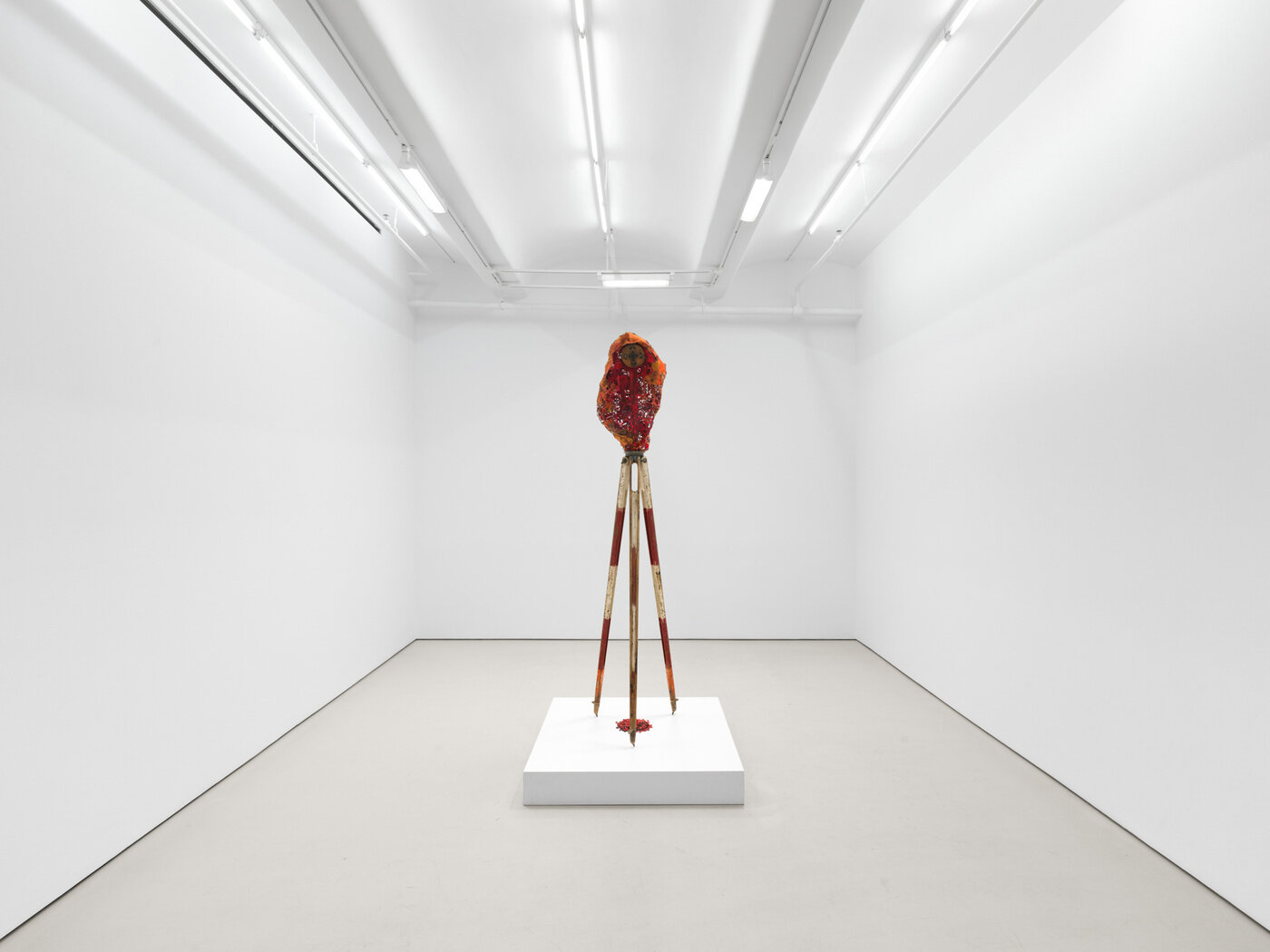 The animals depicted in the embroidered abstractions carry a dual symbolism: they represent historical narratives of violence and subjugation, while their defiant gazes suggest resilience and the possibility of transcendence beyond the oppressive systems that have defined them. Krimes’ work is an intersection of personal narrative and larger social critiques, revealing both the visible and invisible structures of power. His unique approach to textiles, embroidery and sculpture elevates his exploration of incarceration, justice and the human spirit. Krimes, who draws from his personal experience of incarceration, scours centuries of art history to expose the prevalence of images that depict punishment and control. By recontextualizing these images in his work, he interrogates how society has historically represented justice while simultaneously offering a new vision for how these systems can be reshaped. Krimes’ new large-scale embroidered abstractions that anchor the exhibition expand upon the work he was making during and after his incarceration. Among the textiles he uses as his substrate are pieces given to him by people currently and formerly incarcerated, upon which he hand transfers the art historical images. The exhibition also features three sculptures that reflect on the mechanisms of power, control and liberation. Using stones sent to him by currently incarcerated individuals, Krimes wraps them in thread and arranges them into symbolic compositions. One sculpture organizes the stones into antagonistic groups, while another places them under the scrutiny of observation, evoking the concept of the panopticon and its prevalence in broader societal systems. The final sculpture, consisting of thirteen individual forms, shows the stones both encased in cement and presented atop elegant brass stems, suggesting a potential for transcendence beyond confinement. By organizing the exhibition around punitive ideologies and the art historical depictions of confinement, Krimes not only critiques these systems but also opens a dialogue about alternative futures. His intricate use of textiles evokes themes of care, domesticity and fragility, offering a poignant metaphor for navigating the psychological, emotional and social labyrinths of human existence.