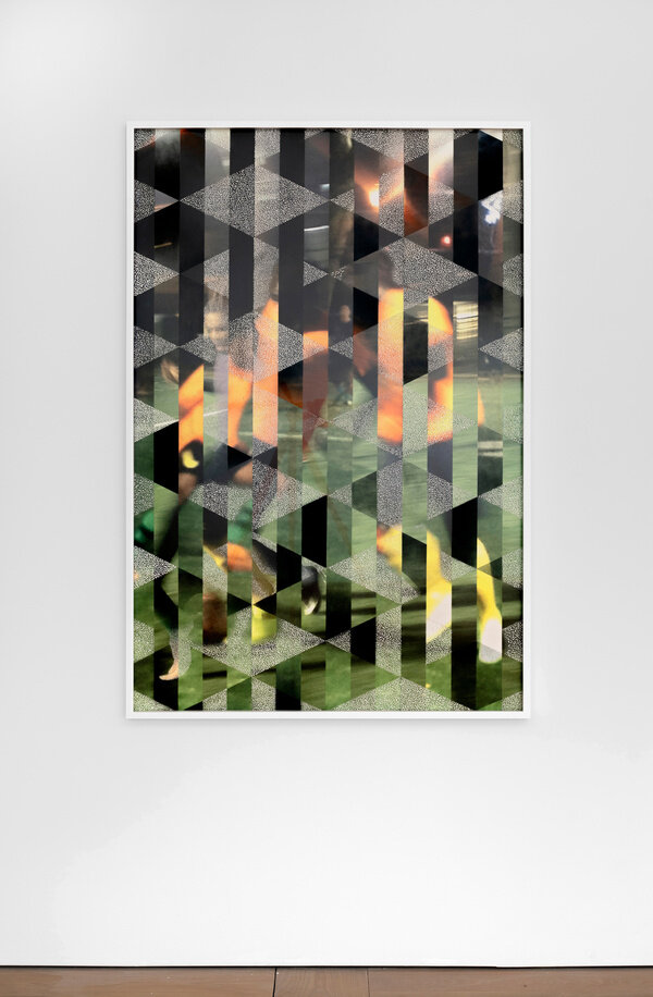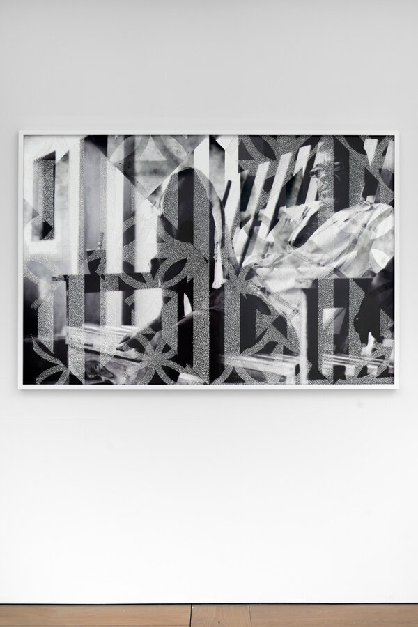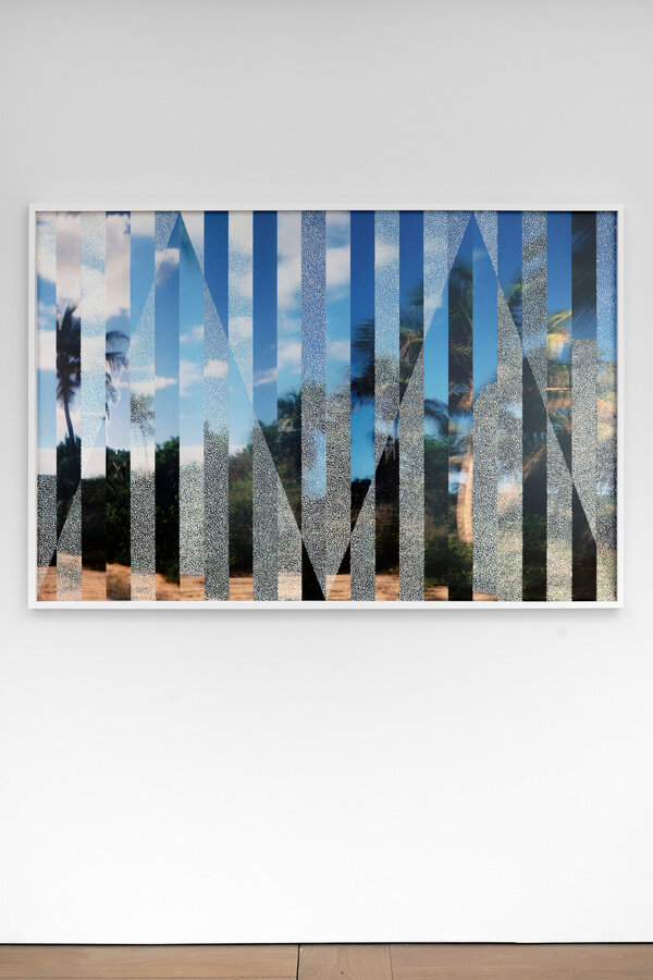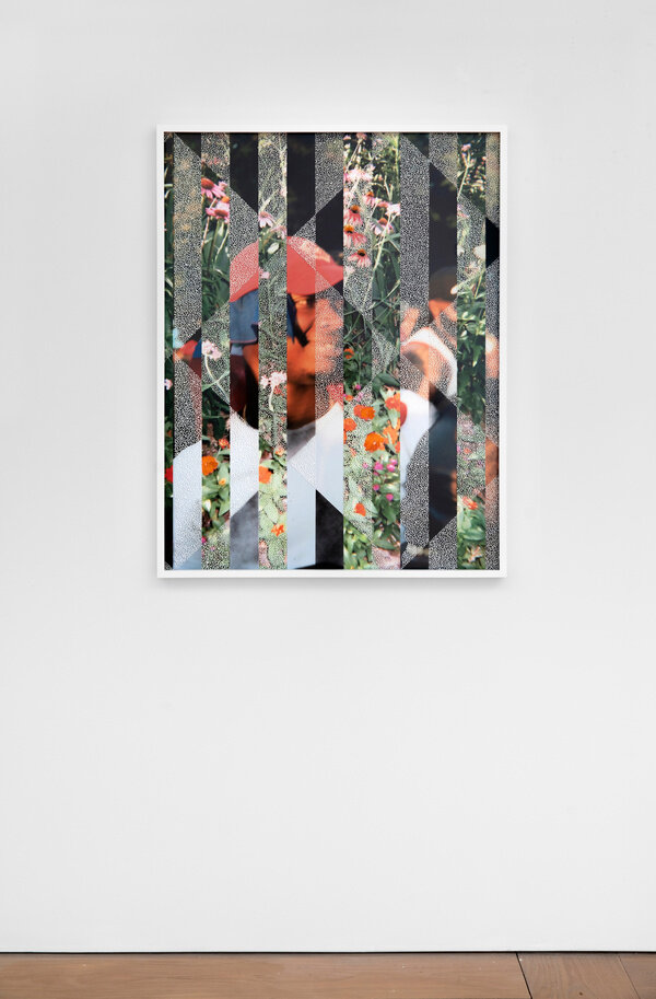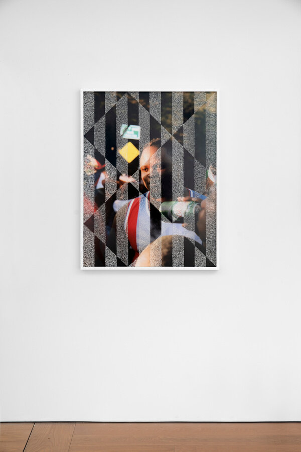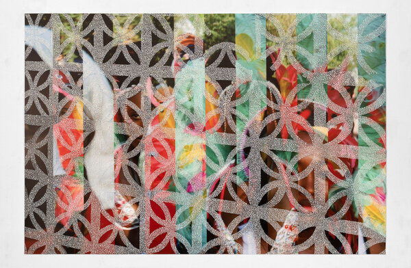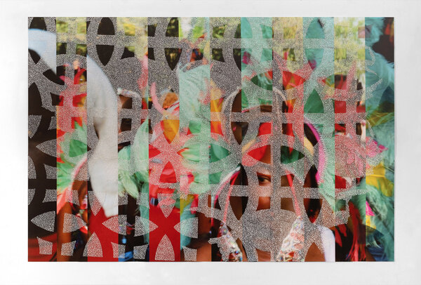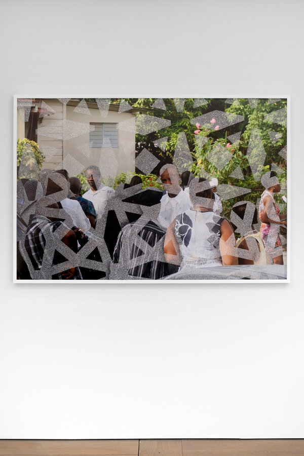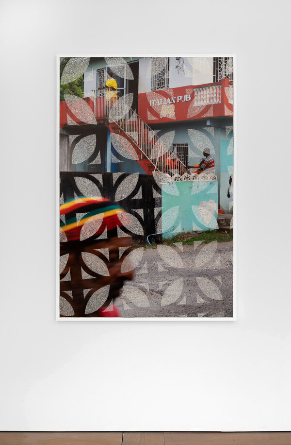 Patterned in the style of Caribbean breeze block fences, modernist architectural elements function as timestamps and veils, meant both to obscure and to protect Smith’s subjects from external gaze. Images originally photographed by Smith both in Jamaica and New York City are rendered with tactile surfaces through his method of picotage layering. While photography typically functions as a way in which to reveal and share information, Smith’s picotage has a concealing and purposefully perplexing effect. Forcing these nuanced diasporic histories into a singular picture plane, Smith encourages layers of discomfort and unease among these outwardly jovial, if not banal, portraits. Picotage, then, serves as an access point as Smith interrogates which elements of identity are allowed to pass through the complexities of borders and migration. Amidst tensions, intricacies, and misidentifying gazes remains the power of community assembly – a reminder of the Jamaican coat of arms, which reads: “Out of many, one people.”