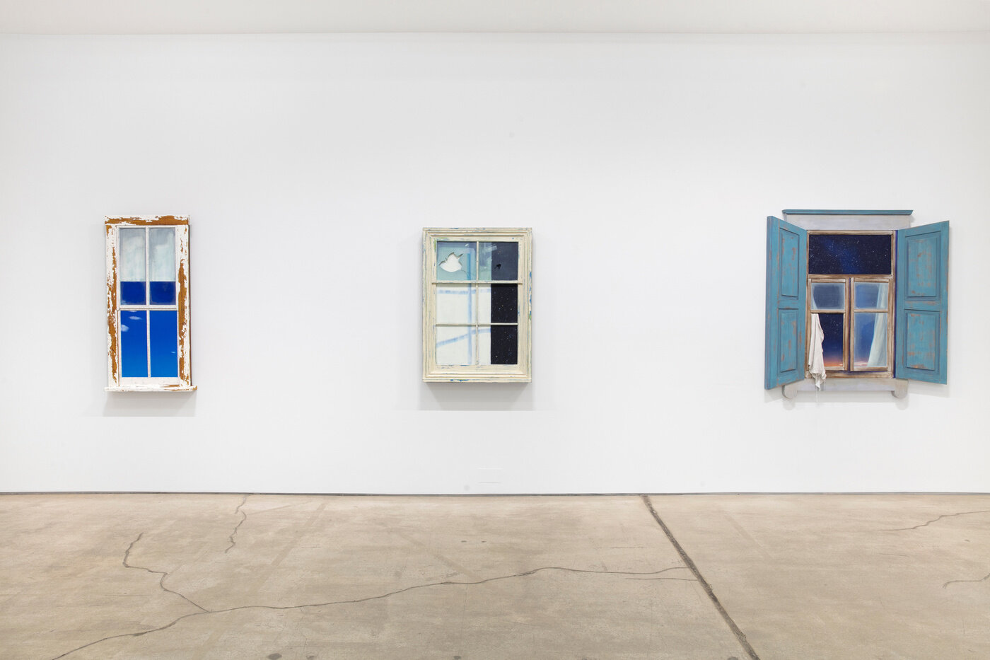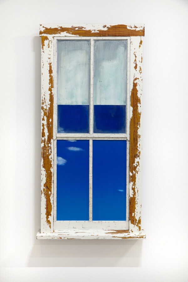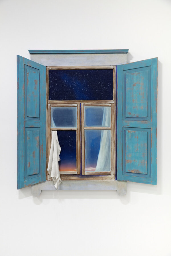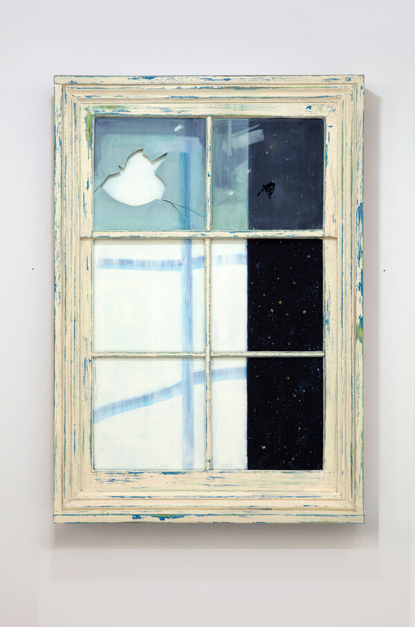 Loft presents a picture of Wayne’s crumbling old studio window. Like many of her pieces that serve as portals —windows, doors, cupboards— the viewer is positioned inside of the space, looking to an outside world that is muddled and unidentifiable, suggesting a place that is visually, metaphorically, and physically unattainable, yet still anticipated and tangible. Other windows in the exhibition confuse our reading of the viewer’s position, offering the perspective of looking in from the outside, but with the internal view being the night sky filled with stars or the crepuscular sky with passing clouds, rather than an architectural interior space.