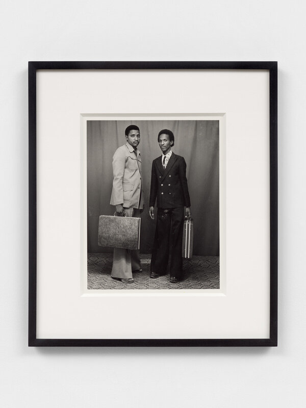 This political expression often took shape through individual and collective presentation, such as fashion, music, and dance – something made palpable by Sidibé’s rhythmic compositions. Often capturing his subjects in the midst of ceremonial action or in joyous moments of nightlife, Sidibé built the narrative of a specific time and space that empowered a culture to dictate their own stories. There is a distinct sense of chronicle felt in the movement of Sidibé’s subjects, who boldly occupy both the photograph’s frame and their recently decolonized nation’s public and leisure spaces. Beyond his candid shots, Sidibé ran a formal portrait studio with a deliberately dramatic décor as a backdrop. In order to capture his sitters’ characters and lives, he orchestrated them into relaxed positions encouraging them to bring along beloved personal objects, like a new motorcycle or a James Brown record. It was through his portraiture that Sidibé documented the changing fashions and aspirations of generations in Bamako.