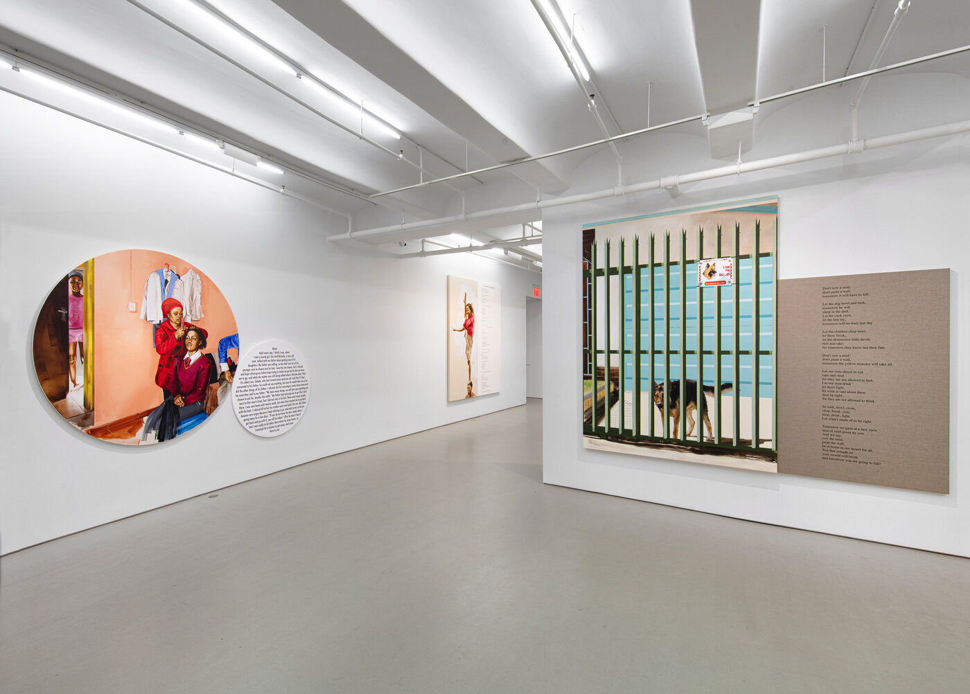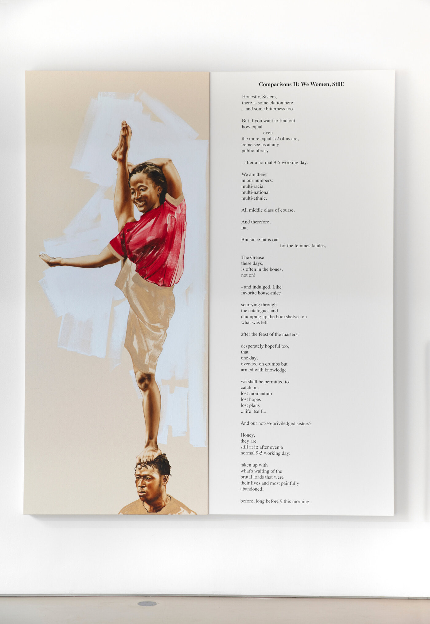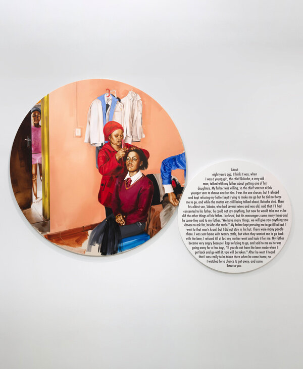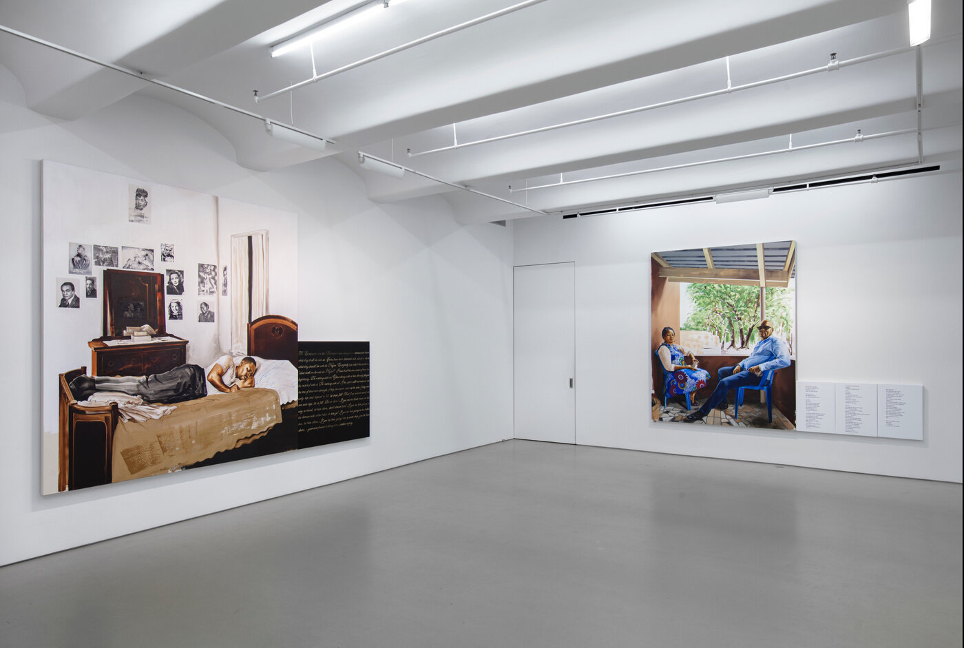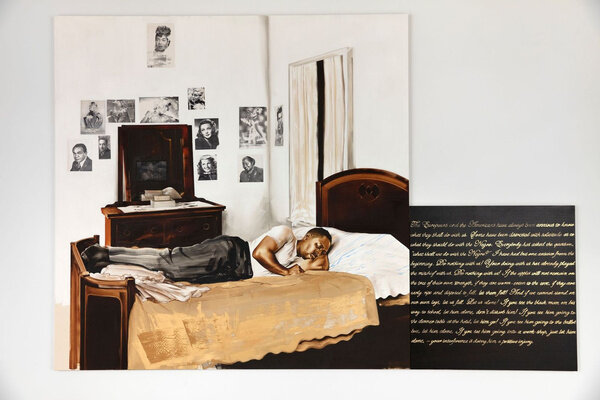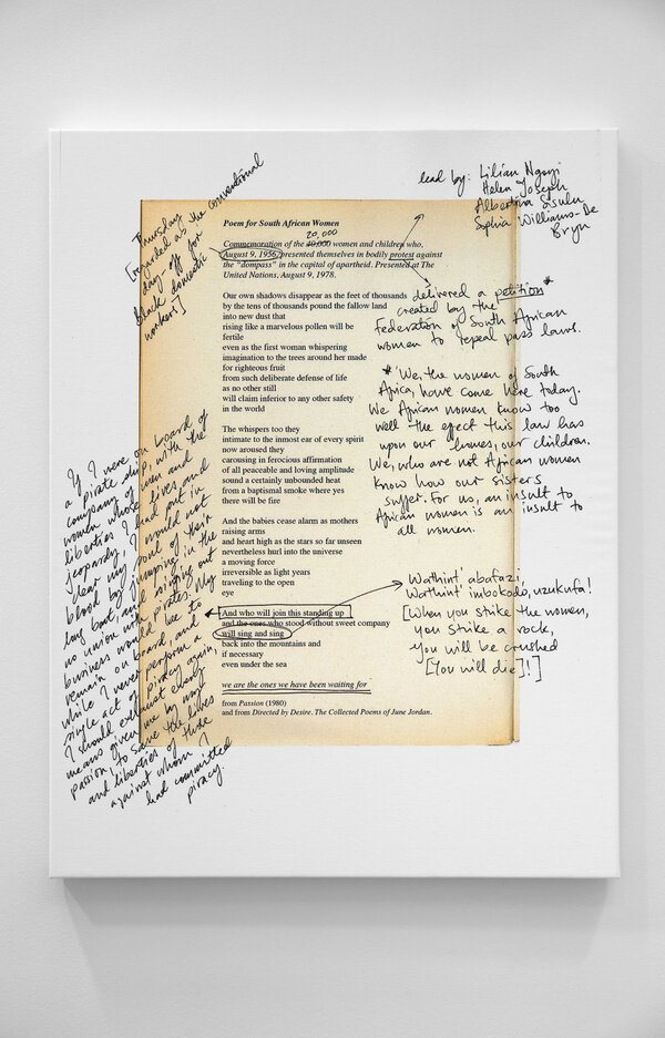 The title of Mokgosi’s 20th Street installation, The social revolution of our time cannot take its poetry from the past but only from the poetry of the future., is taken from Karl Marx's The Eighteenth Brumaire of Louis Bonaparte. This text points to the limits of revolutionary discourses and proposes that it is only through disavowing the past that revolutionary action can occur. Similar to this argument, this body of work argues both for a disavowal of past grand narratives as well as the recuperation of non-Western forms of knowledge that were not privileged to coexist with conventional or established discursive frameworks. All twelve paintings are paired with a text that is taken from the writings of women either from Africa or the African Diaspora. The texts and paintings examine a wide range of issues, from African feminism and the struggle for liberation by African countries, to love, solidarity, and aesthetics. By pairing text and image, Mokgosi's work aims to further questions around the politics of representation and strategies of resistance. Pan-African Pulp, Mokgosi’s body of work at 24th Street, uses popular southern African pulp magazines or photo-novels to examine, broadly, the history of Pan-Africanism. These photo-novels, colloquially referred to as look-books, were first printed in the 1960s as an off-shoot of Drum Publications. Unlike Drum magazine, which addressed politics and issues of race in South Africa, photo-novels such as Lance Spearman avoided engaging with debates around politics, instead choosing to offer entertaining James Bond-like episodes of crime fighting. The photo novels—a less expensive alternative to filmmaking—are composed of staged photographs depicting action scenes, and follow a script conveyed with speech bubbles written in English, combining elements of comic books, films, and magazines.