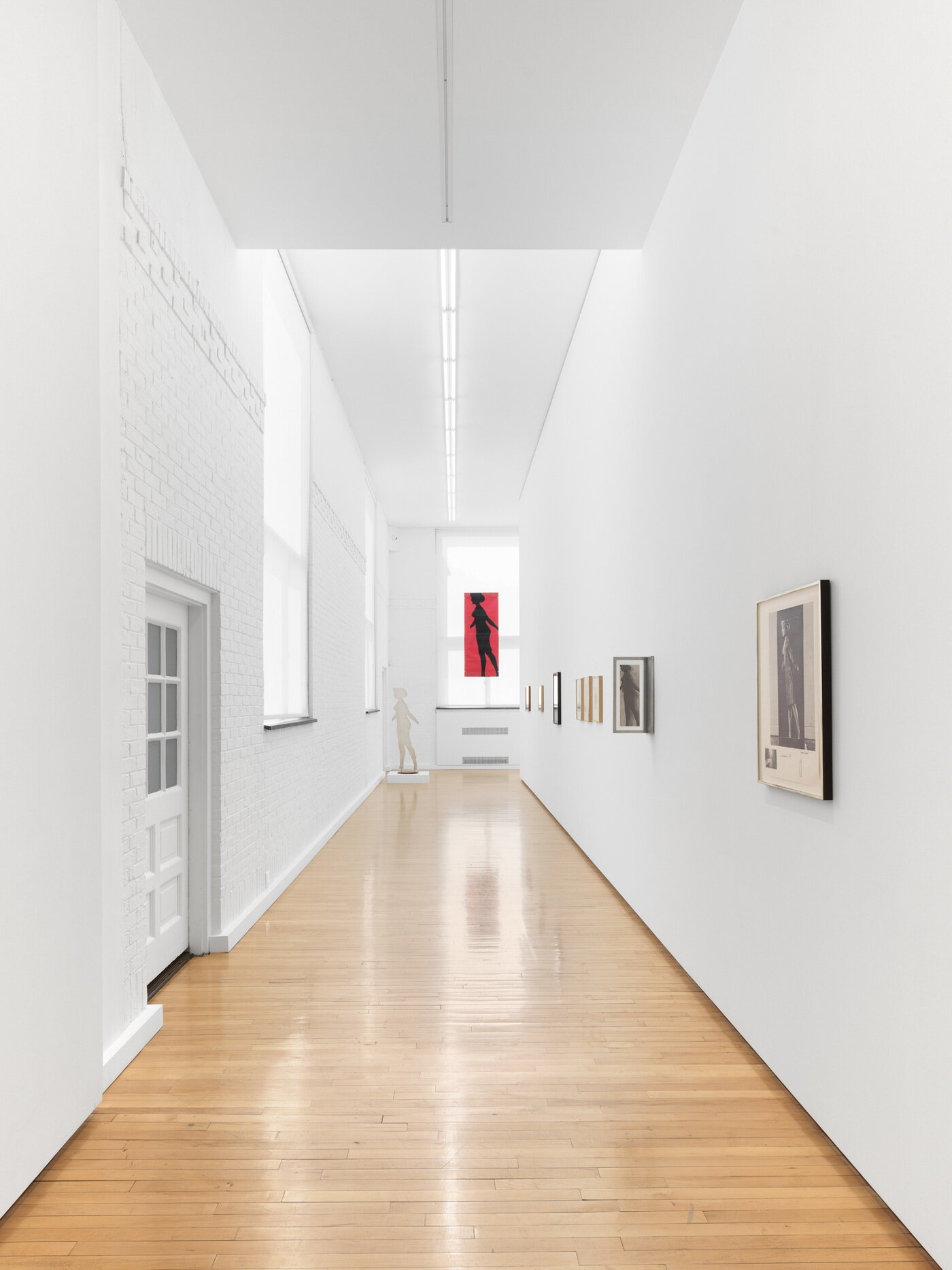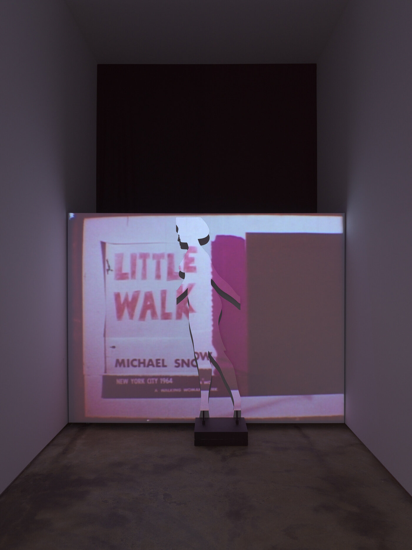 No body of work exemplifies Snow’s process more than Walking Woman. The series began when Snow cut out a five-foot silhouette from a piece of cardboard. Born from Snow’s imagination, the cut-out outlined a woman in forward motion whose head, arms, and legs were contained by the rectangular edges of the cardboard. From this image, Snow made Four to Five, 1962, a photographic series staging the stencil in real cityscapes; Shot!, 1963, a composition of small papers stamped with the Walking Woman; and Little Walk, 1964, a live-action film and wide ranging sampling of Walking Woman works in his studio, projected on a life-size free-standing Walking Woman cutout. His prerogative was not a conceptual conclusion, but a desire to comprehend the multifaceted meaning of an image when translated through an expansive spectrum of materials.