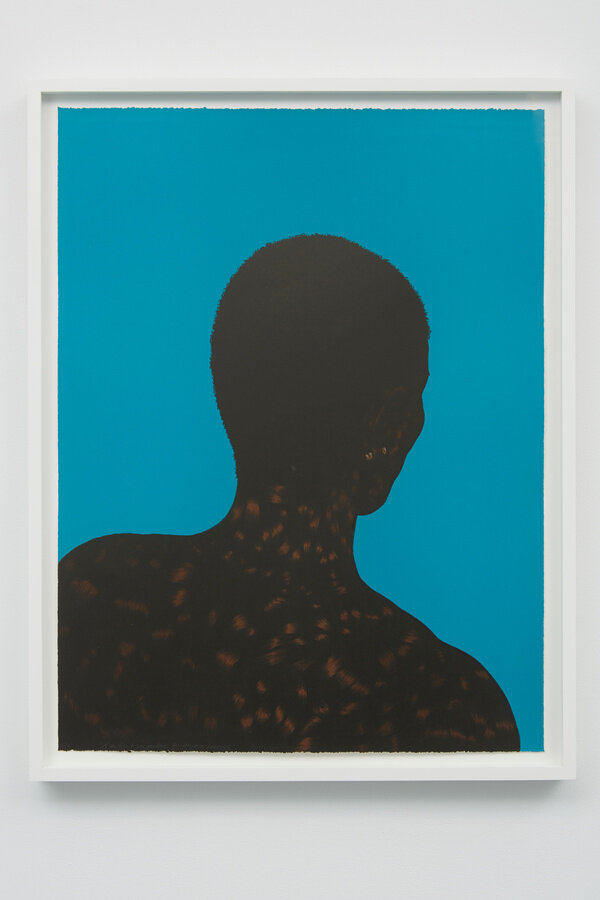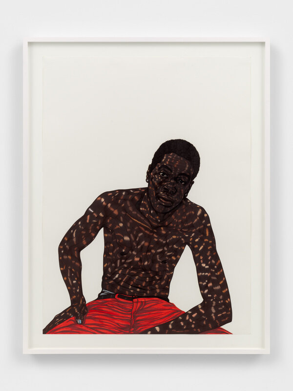 is a series of self-portraits recording the range of hairstyles donned by the artist. By isolating the figure against the blank white background and repeating the subject, Odutola is confining the differences mainly to the hair and position of the body. The interest is less in style and more in the undertones and associations this specific physical embellishment provides when thinking about the pliability of identity. These works dance between the understandings of one’s own identity and the understanding of one’s identity as it relates what is being reflected back from another’s gaze.