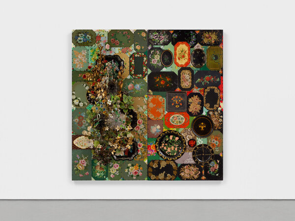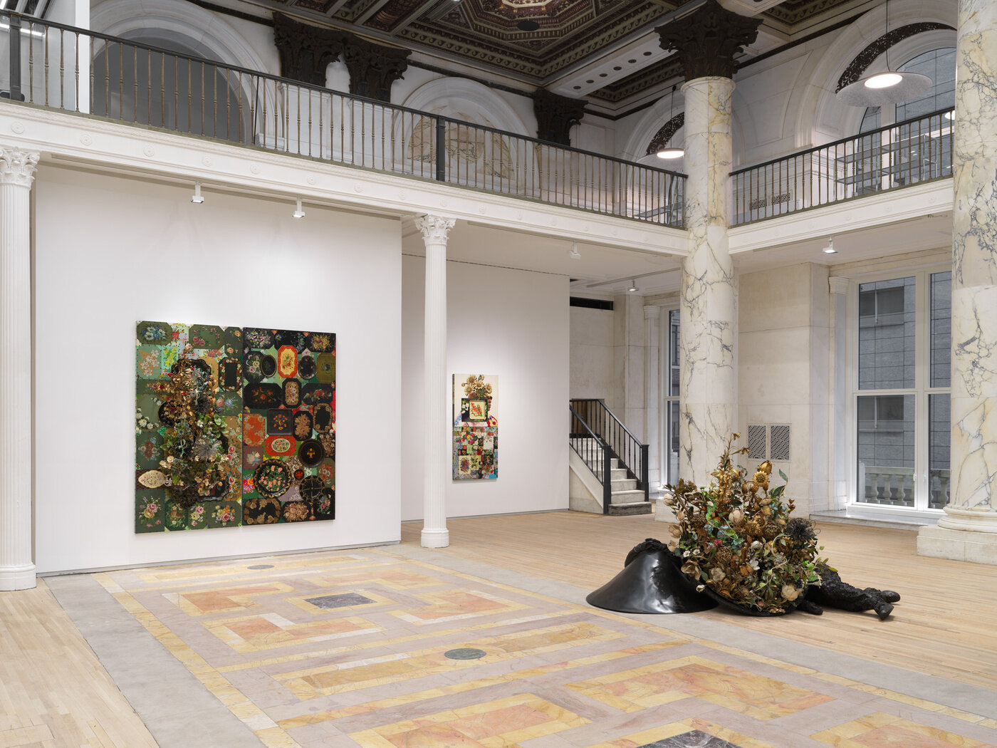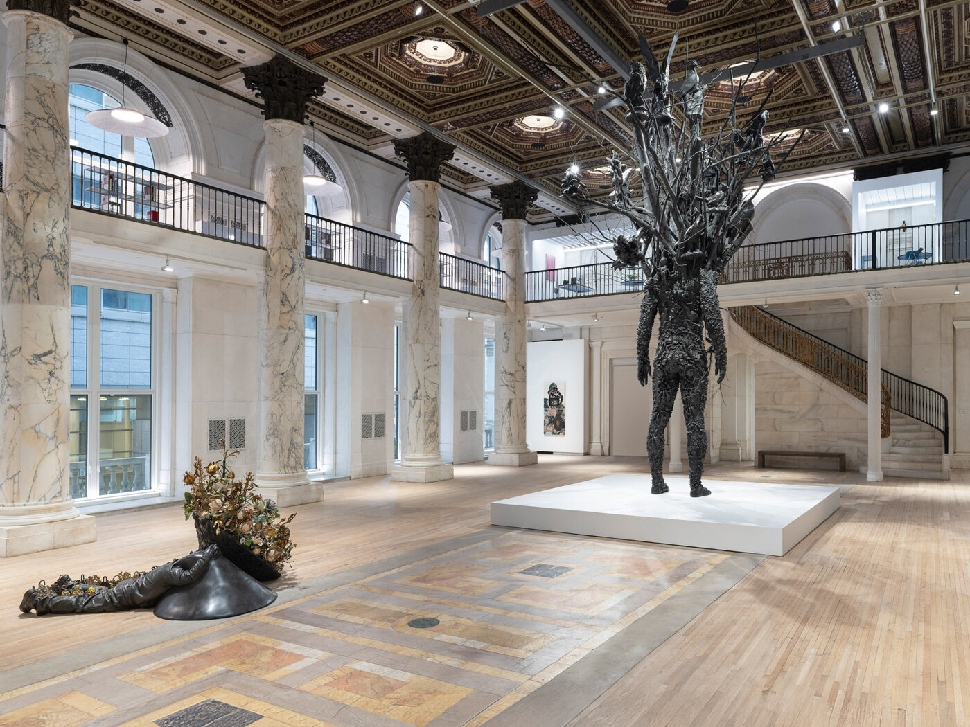 At nearly twenty-six feet tall, Amalgam (Origin) grounds viewers with a connection to humanity but quickly lifts them to a place of awe or spirituality. Intricate and ornate designs cover and connect the figure to a place where we might expect to see a face. Instead, Cave has rendered a complex migration hub through a flourishing of branches and birds of all types, poetically gesturing to nature’s sense of evolution and possibility. Nearby, Amalgam (Plot) shows two bronze figures lying side by side recalling a still from video footage portraying the ongoing racially motivated violence cast onto Black bodies. One figure faces up toward the sky and the second face down with hands behind its head, taking cover. The figure lying face up seems to grow an oversized garden plot bursting with vintage tole florals in place of its visage. In this context, the garden becomes both a memorial and a symbol of resistance and renewal. In a gallery around the corner, on Broadway, a third Amalgam is seated against a bespoke wall work, visible at all times to New York City passersby. Together, the Amalgams are embodiments of growth and resistance in the face of oppressive structures. They continue the propulsion within Cave’s practice towards public engagement and the civic and social responsibility of artwork.