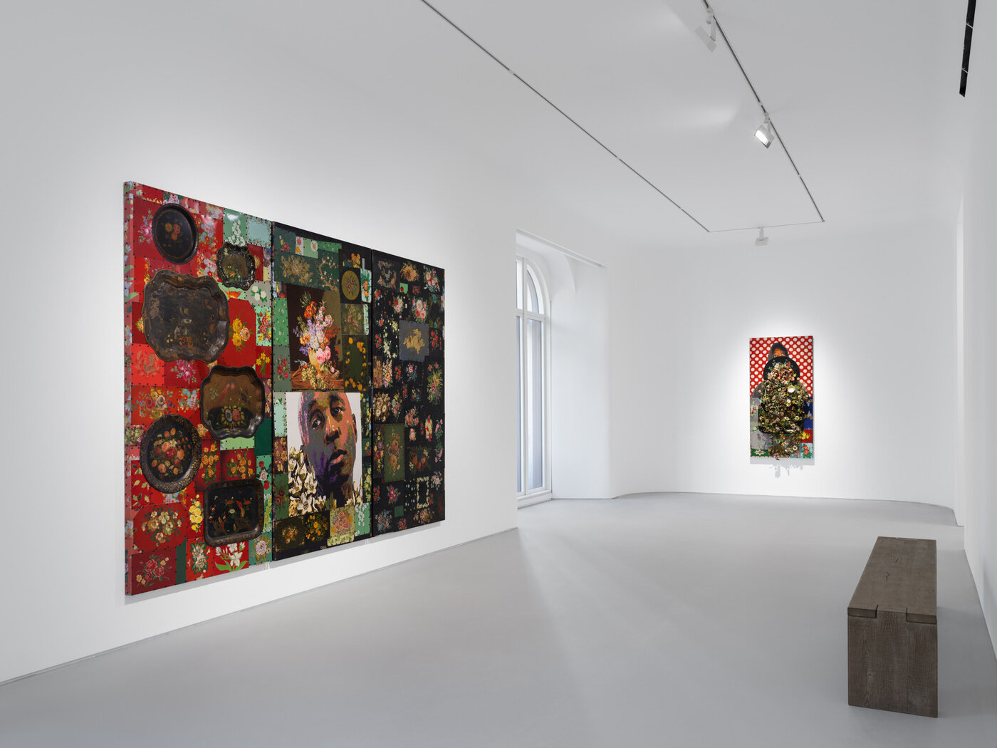 Debuting alongside these bronze figures is Cave’s newest series, Graphts. These mixed media assemblages situate needlepoint portraits of the artist amongst fields of florals and color constructed from vintage serving trays. While Cave has often used his own body within his artwork, this is the first time that he has revealed a recognizable self.