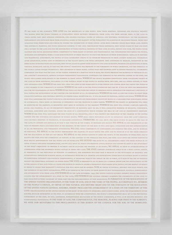 In Declaration Untitled (Blended Israeli and Palestinian Declarations of Independence, abbreviated), Attie employs the antiquated practice of letterpress to further complicate the subject matter through visual seduction and the aura of the human hand. In Double Talk (People, Land, State), Attie moves into working with the original Declarations, using text and subtle color, to both bridge and delineate the two documents by highlighting the three nouns most in common between them.