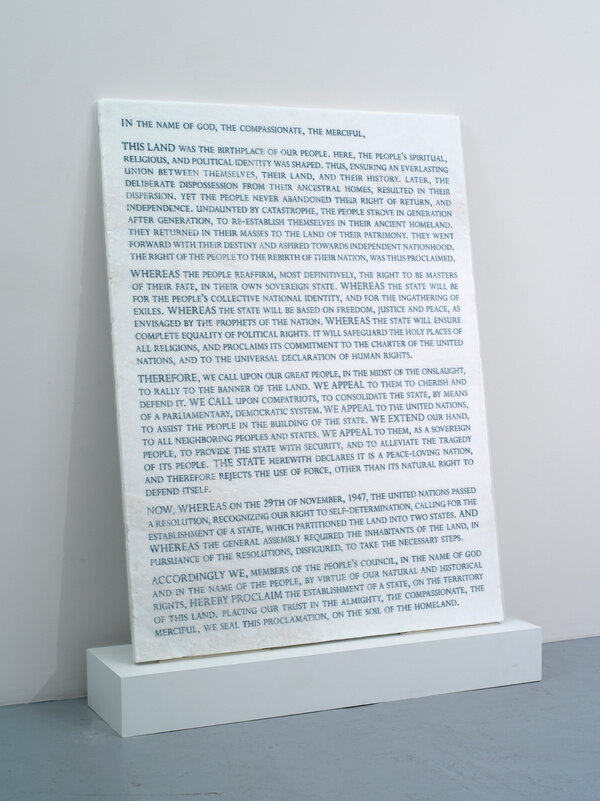 First coming to prominence in the 1990’s with his powerful installations across Europe using a variety of media including on-location slide projection and underwater light boxes, Attie incorporated the surfaces of architecture and water to explore issues of memory and lost histories of the Second World War. In this new series he has turned his attention to the Israeli - Palestinian conflict, but through a dissection of the complexity and insanity of national identities rooted in contested claims and histories. Returning to video as well as utilizing materials that are new to his practice such as marble, lenticular printing, letterpress and Braille, Attie creates an aesthetic language that goes beyond political ideology in artful, tactile and expressive forms.