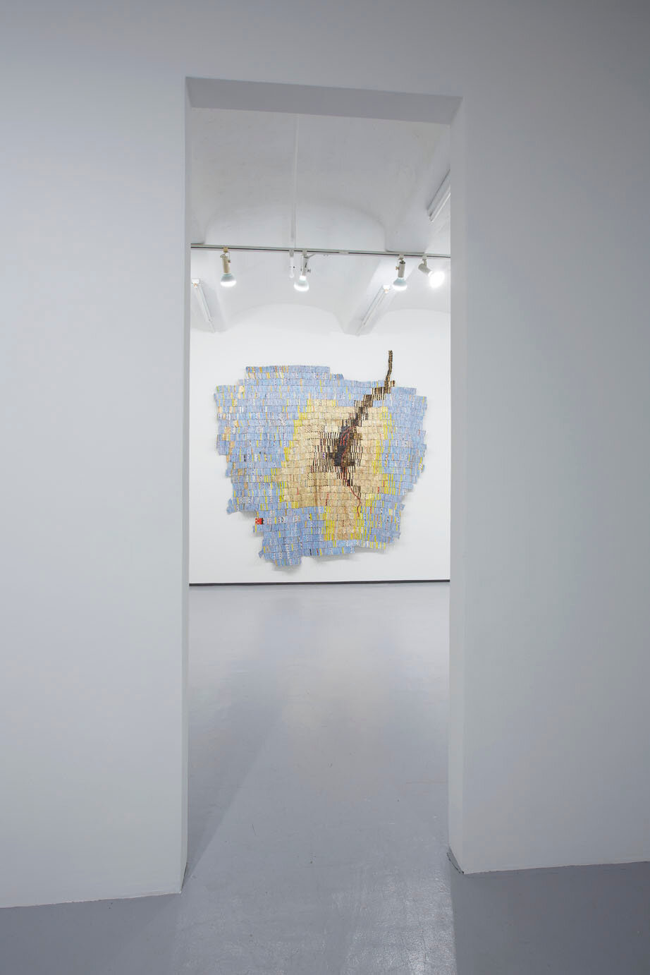 Each of the works functions as a solitary plane mapped with lines and borders that sometimes cut through with sharp determination and other times dance along the perimeter. The wall-bounded surface is pushed and draped, changing every time the work is installed, which Anatsui encourages. He audaciously trusts chance, allowing the work to exist on its own terms and to continue to morph into the unexpected. Ultimately, Anatsui’s work combines narrative, concept and physicality into infinite arrangements, like a melody that never plays the same twice.